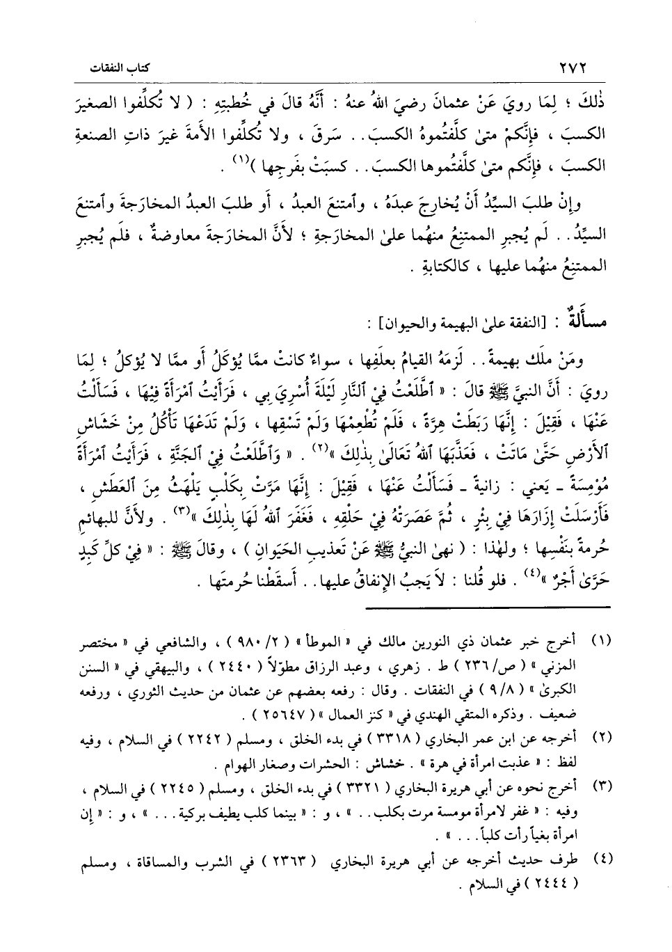 ومن ملك بهيمة.. لزمه القيام بعلفها، سواء كانت مما يؤكل أو مما لا يؤكل؛ لما روي: أن النبي - صَلَّى اللَّهُ عَلَيْهِ وَسَلَّمَ - قال: «اطلعت في النار ليلة أسري بي، فرأيت امرأة فيها، فسألت عنها، فقيل: إنها ربطت هرة، فلم تطعمها ولم تسقها، ولم تدعها تأكل من خشاش الأرض حتى ماتت، فعذبها الله تعالى بذلك» . «واطلعت في الجنة، فرأيت امرأة مومسة - يعني: زانية - فسألت عنها، فقيل: إنها مرت بكلب يلهث من العطش، فأرسلت إزارها في بئر، ثم عصرته في حلقه، فغفر الله لها بذلك» . ولأن للبهائم حرمة بنفسها؛ ولهذا: (نهى النبي - صَلَّى اللَّهُ عَلَيْهِ وَسَلَّمَ - عن تعذيب الحيوان) ، وقال - صَلَّى اللَّهُ عَلَيْهِ وَسَلَّمَ -: «في كل كبد حرى أجر» . فلو قلنا: لا يجب الإنفاق عليها.. أسقطنا حرمتها.