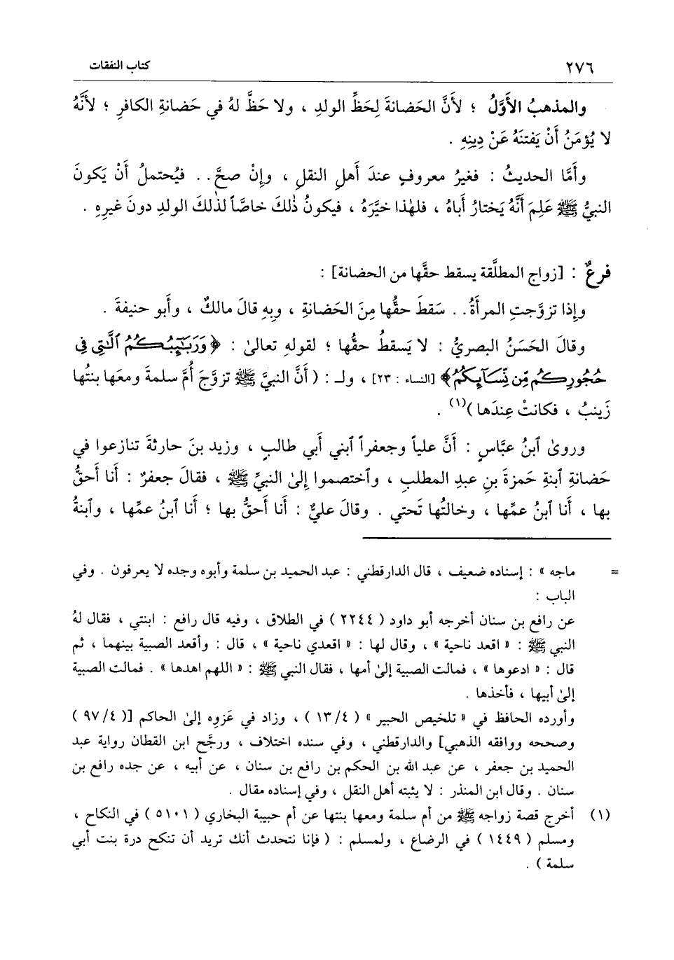 «وروى ابن عباس: أن علياً وجعفراً ابني أبي طالب، وزيد بن حارثة تنازعوا في حضانة ابنة حمزة بن عبد المطلب، واختصموا إلى النبي - صَلَّى اللَّهُ عَلَيْهِ وَسَلَّمَ -، فقال جعفر: أنا أحق بها، أنا ابن عمها، وخالتها تحتي. وقال علي: أنا أحق بها؛ أنا ابن عمها، وابنة