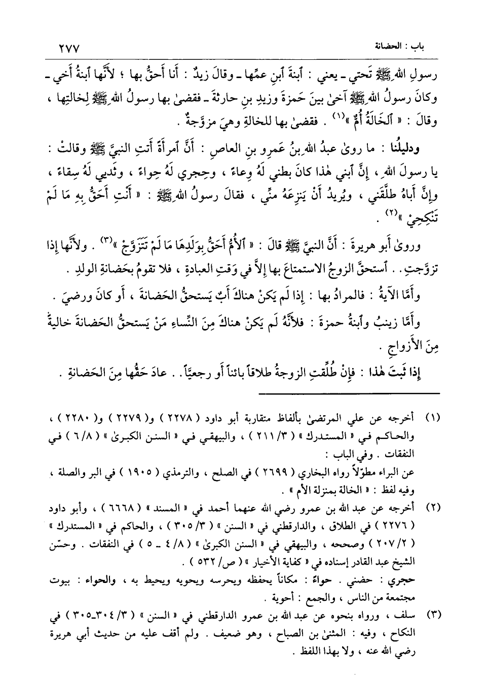 رسول الله - صَلَّى اللَّهُ عَلَيْهِ وَسَلَّمَ - تحتي - يعني: ابنة ابن عمها - وقال زيد: أنا أحق بها؛ لأنها ابنة أخي - وكان رسول الله - صَلَّى اللَّهُ عَلَيْهِ وَسَلَّمَ - آخى بين حمزة وزيد بن حارثة - فقضى بها رسول الله - صَلَّى اللَّهُ عَلَيْهِ وَسَلَّمَ - لخالتها، وقال: " الخالة أم ". فقضى بها للخالة وهي مزوجة» .