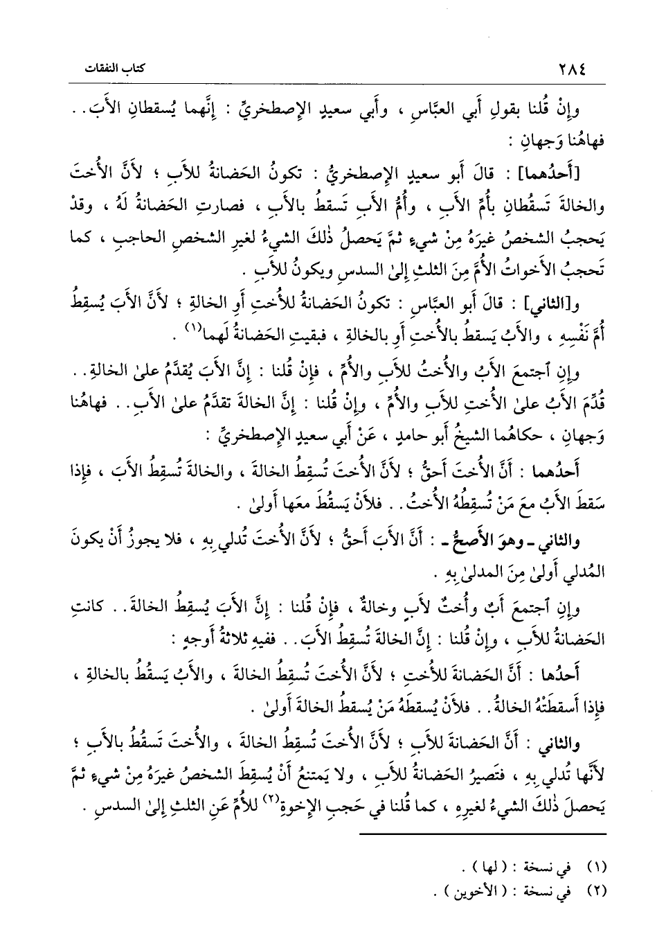 والثاني: أن الحضانة للأب؛ لأن الأخت تسقط الخالة، والأخت تسقط بالأب؛ لأنها تدلي به، فتصير الحضانة للأب، ولا يمتنع أن يسقط الشخص غيره من شيء ثم يحصل ذلك الشيء لغيره، كما قلنا في حجب الإخوة للأم عن الثلث إلى السدس.
