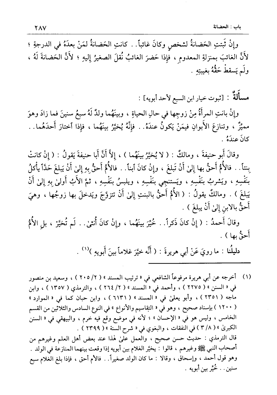 وقال أبو حنيفة، ومالك: (لا يخير بينهما) ، إلا أن أبا حنيفة يقول: (إن كانت بنتاً.. فالأم أحق بها إلى أن تبلغ، وإن كان ابناً.. فالأم أحق به إلى أن يبلغ حداً يأكل بنفسه، ويشرب بنفسه، ويستنجي بنفسه، ويلبس بنفسه، ثم الأب أولى به إلى أن يبلغ) . ومالك يقول: (الأم أحق بالبنت إلى أن تتزوج ويدخل بها زوجها، وهي أحق بالابن إلى أن يبلغ) .