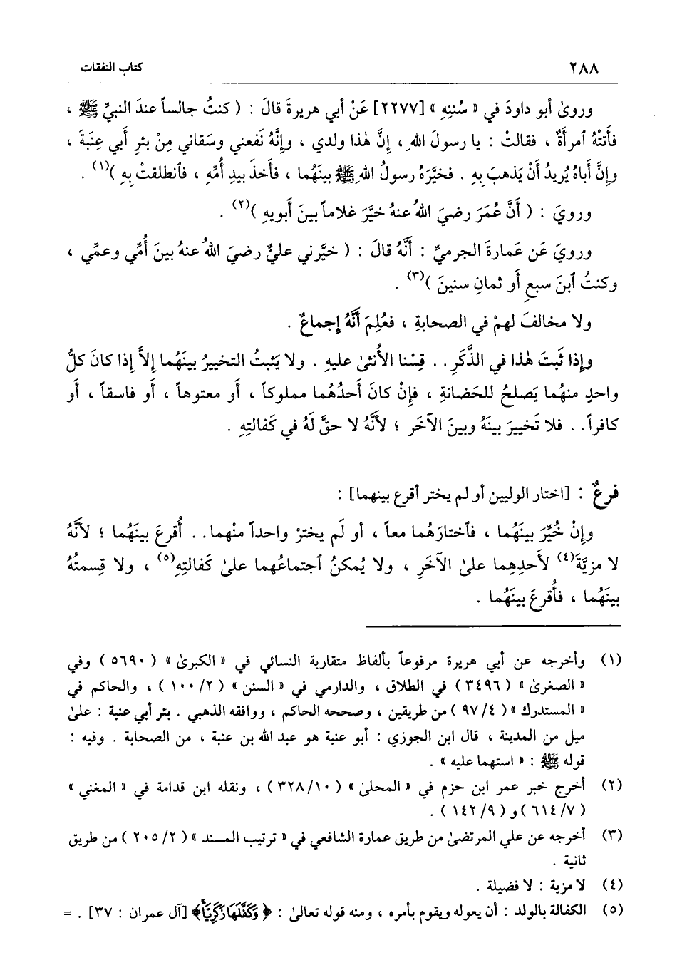 وروى أبو داود في " سننه " [2277] «عن أبي هريرة قال: (كنت جالساً عند النبي - صَلَّى اللَّهُ عَلَيْهِ وَسَلَّمَ -، فأتته امرأة، فقالت: يا رسول الله، إن هذا ولدي، وإنه نفعني وسقاني من بئر أبي عنبة، وإن أباه يريد أن يذهب به. فخيره رسول الله - صَلَّى اللَّهُ عَلَيْهِ وَسَلَّمَ - بينهما، فأخذ بيد أمه، فانطلقت به» .
