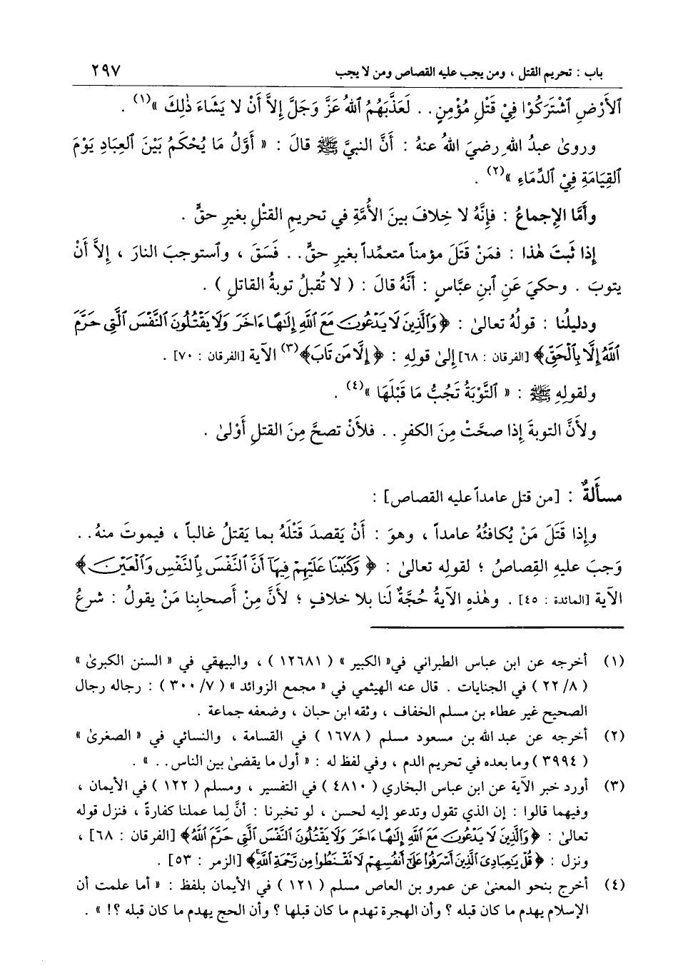 وروى عبد الله - رَضِيَ اللَّهُ عَنْهُ -: أن النبي - صَلَّى اللَّهُ عَلَيْهِ وَسَلَّمَ - قال: «أول ما يحكم بين العباد يوم القيامة في الدماء» .