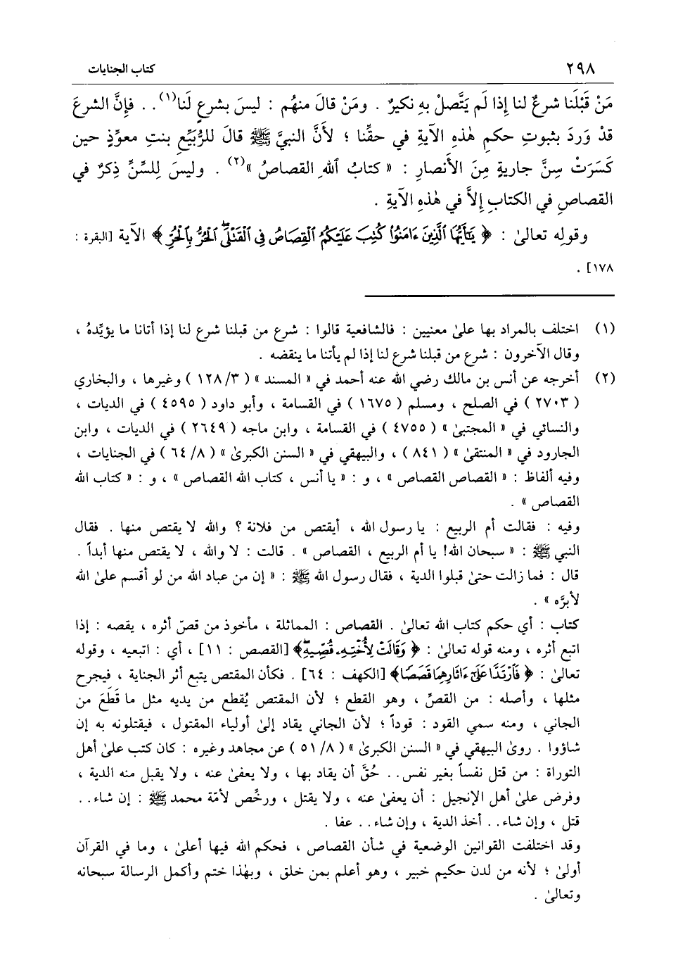 من قبلنا شرع لنا إذا لم يتصل به نكير. ومن قال منهم: ليس بشرع لنا.. فإن الشرع قد ورد بثبوت حكم هذه الآية في حقنا؛ لأن «النبي - صَلَّى اللَّهُ عَلَيْهِ وَسَلَّمَ - قال للربيع بنت معوذ حين كسرت سن جارية من الأنصار: " كتاب الله القصاص» . وليس للسن ذكر في القصاص في الكتاب إلا في هذه الآية.