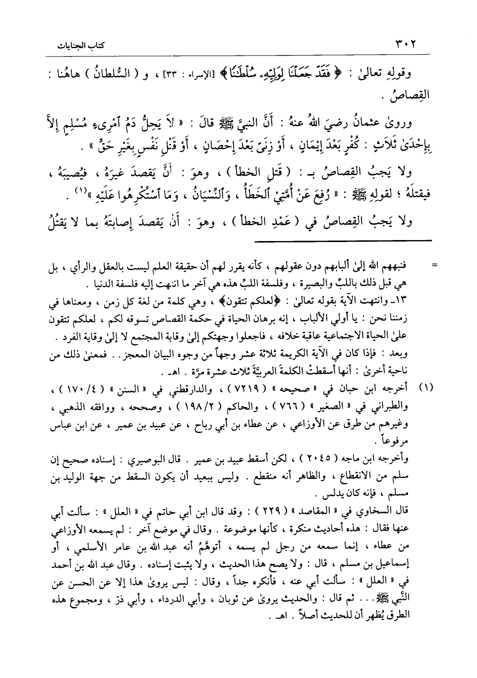 وروى عثمان - رَضِيَ اللَّهُ عَنْهُ -: أن النبي - صَلَّى اللَّهُ عَلَيْهِ وَسَلَّمَ - قال: «لا يحل دم امرئ مسلم إلا بإحدى ثلاث: كفر بعد إيمان، أو زنى بعد إحصان، أو قتل نفس بغير حق» .