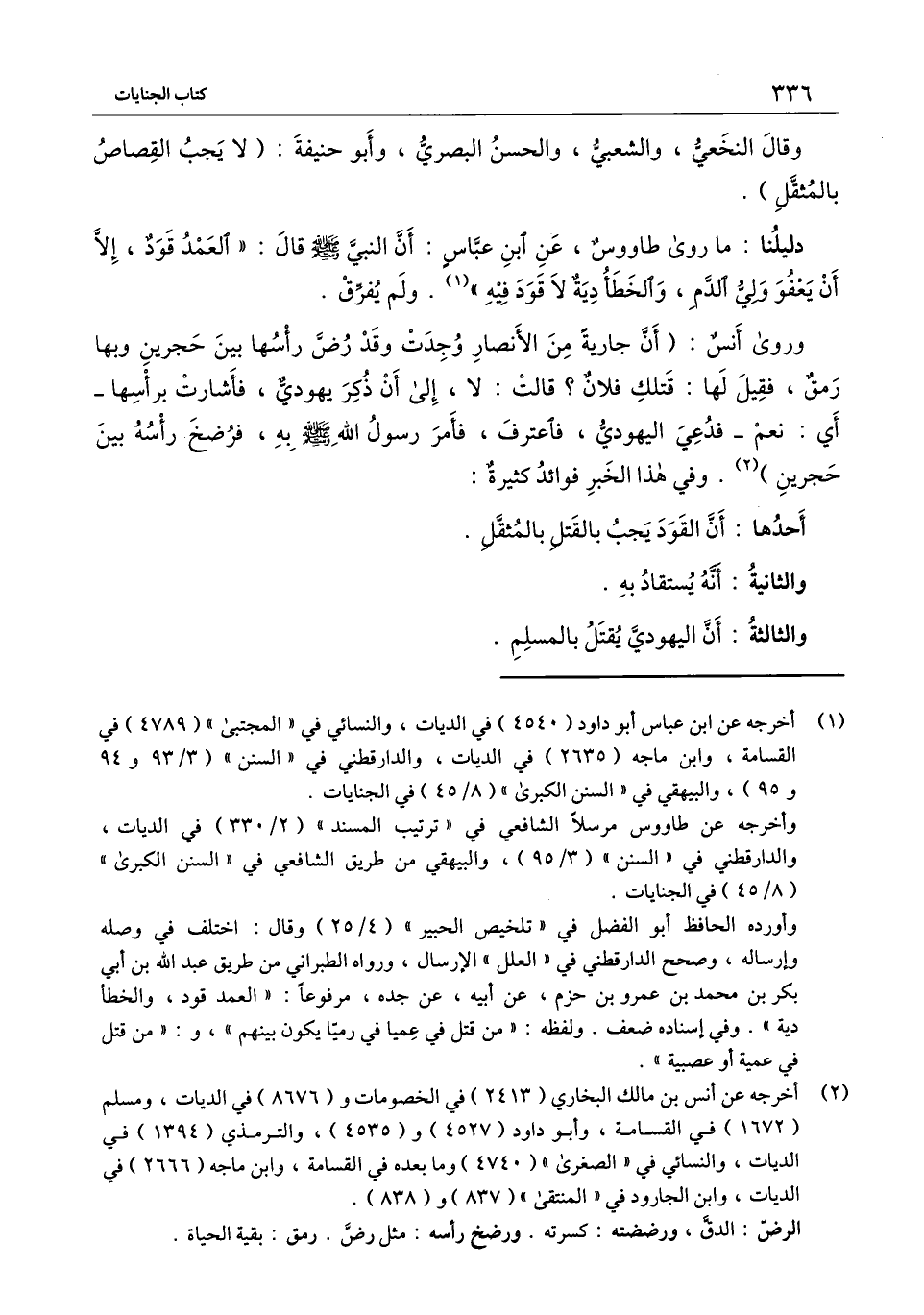 وروى أنس: «أن جارية من الأنصار وجدت وقد رض رأسها بين حجرين وبها رمق، فقيل لها: قتلك فلان؟ قالت: لا، إلى أن ذكر يهودي، فأشارت برأسها - أي: نعم - فدعي اليهودي، فاعترف، فأمر رسول الله - صَلَّى اللَّهُ عَلَيْهِ وَسَلَّمَ - به، فرضخ رأسه بين حجرين» . وفي هذا الخبر فوائد كثيرة: