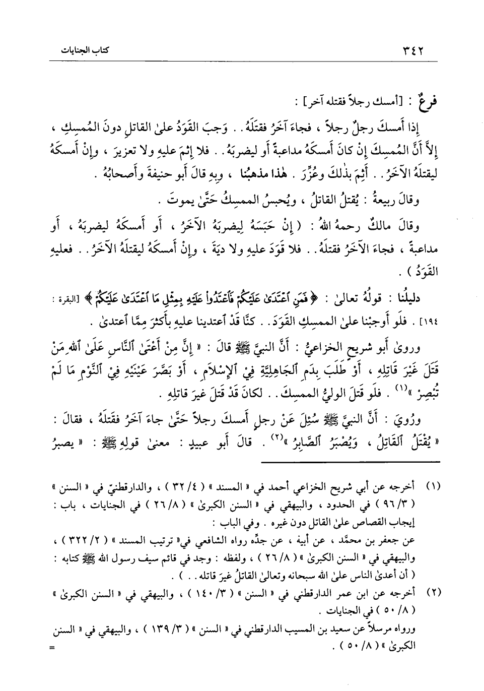 وروي: «أن النبي - صَلَّى اللَّهُ عَلَيْهِ وَسَلَّمَ - سئل عن رجل أمسك رجلاً حتى جاء آخر فقتله، فقال: " يقتل القاتل، ويصبر الصابر» قال أبو عبيد: معنى قوله - صَلَّى اللَّهُ عَلَيْهِ وَسَلَّمَ -: " يصبر