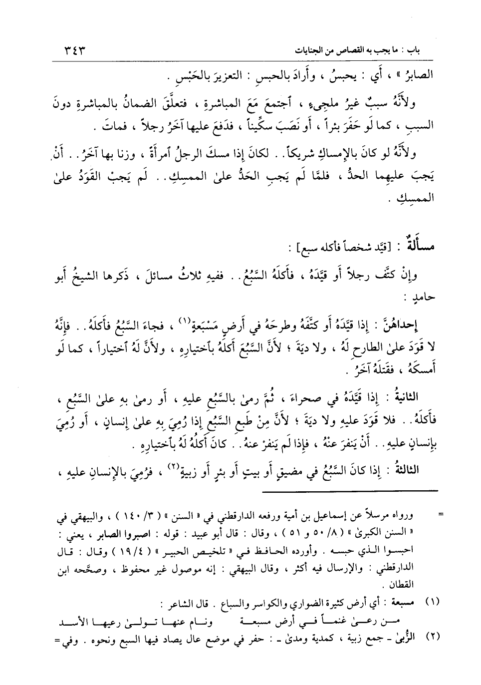 وإن كتف رجلاً أو قيده، فأكله السبع.. ففيه ثلاث مسائل، ذكرها الشيخ أبو حامد: