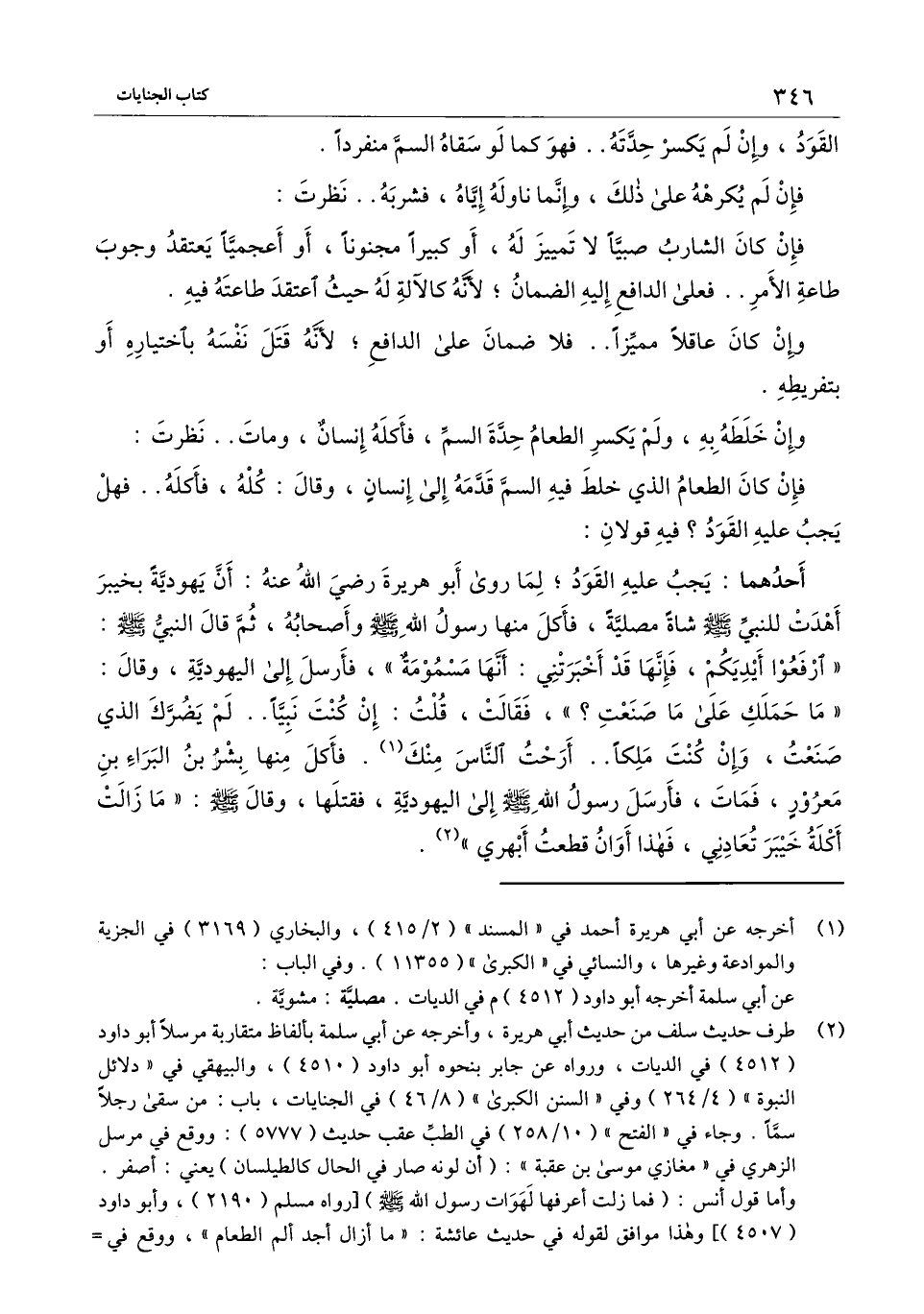 أحدهما: يجب عليه القود؛ لما روى أبو هريرة - رَضِيَ اللَّهُ عَنْهُ -: «أن يهودية بخيبر أهدت للنبي - صَلَّى اللَّهُ عَلَيْهِ وَسَلَّمَ - شاة مصلية، فأكل منها رسول الله - صَلَّى اللَّهُ عَلَيْهِ وَسَلَّمَ - وأصحابه، ثم قال النبي - صَلَّى اللَّهُ عَلَيْهِ وَسَلَّمَ -: " ارفعوا أيديكم، فإنها قد أخبرتني: أنها مسمومة "، فأرسل إلى اليهودية، وقال: " ما حملك على ما صنعت؟ "، فقالت: قلت: إن كنت نبياً.. لم يضرك الذي صنعت، وإن كنت ملكاً.. أرحت الناس منك. فأكل منها بشر بن البراء بن معرور، فمات، فأرسل رسول الله - صَلَّى اللَّهُ عَلَيْهِ وَسَلَّمَ - إلى اليهودية، فقتلها، وقال - صَلَّى اللَّهُ عَلَيْهِ وَسَلَّمَ -: " ما زالت أكلة خيبر تعادني، فهذا أوان قطعت أبهري» .