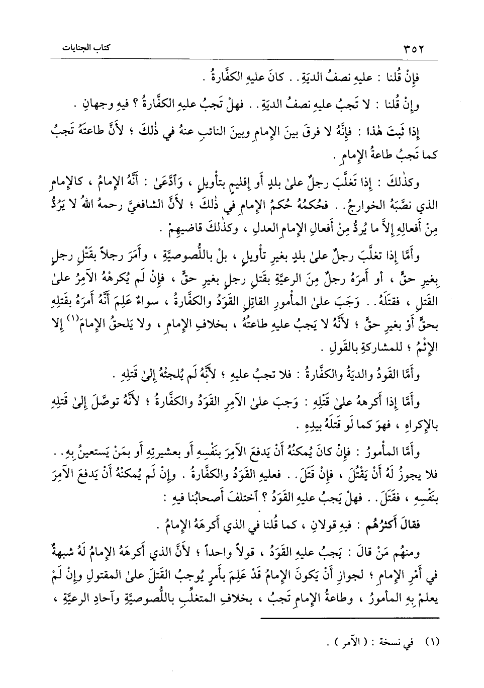 وأما إذا تغلب رجل على بلد بغير تأويل، بل باللصوصية، وأمر رجلاً بقتل رجل بغير حق، أو أمره رجل من الرعية بقتل رجل بغير حق، فإن لم يكرهه الآمر على القتل، فقتله.. وجب على المأمور القاتل القود والكفارة، سواء علم أنه أمره بقتله بحق أو بغير حق؛ لأنه لا يجب عليه طاعته بخلاف الإمام، ولا يلحق الإمام إلا الإثم؛ للمشاركة بالقول.