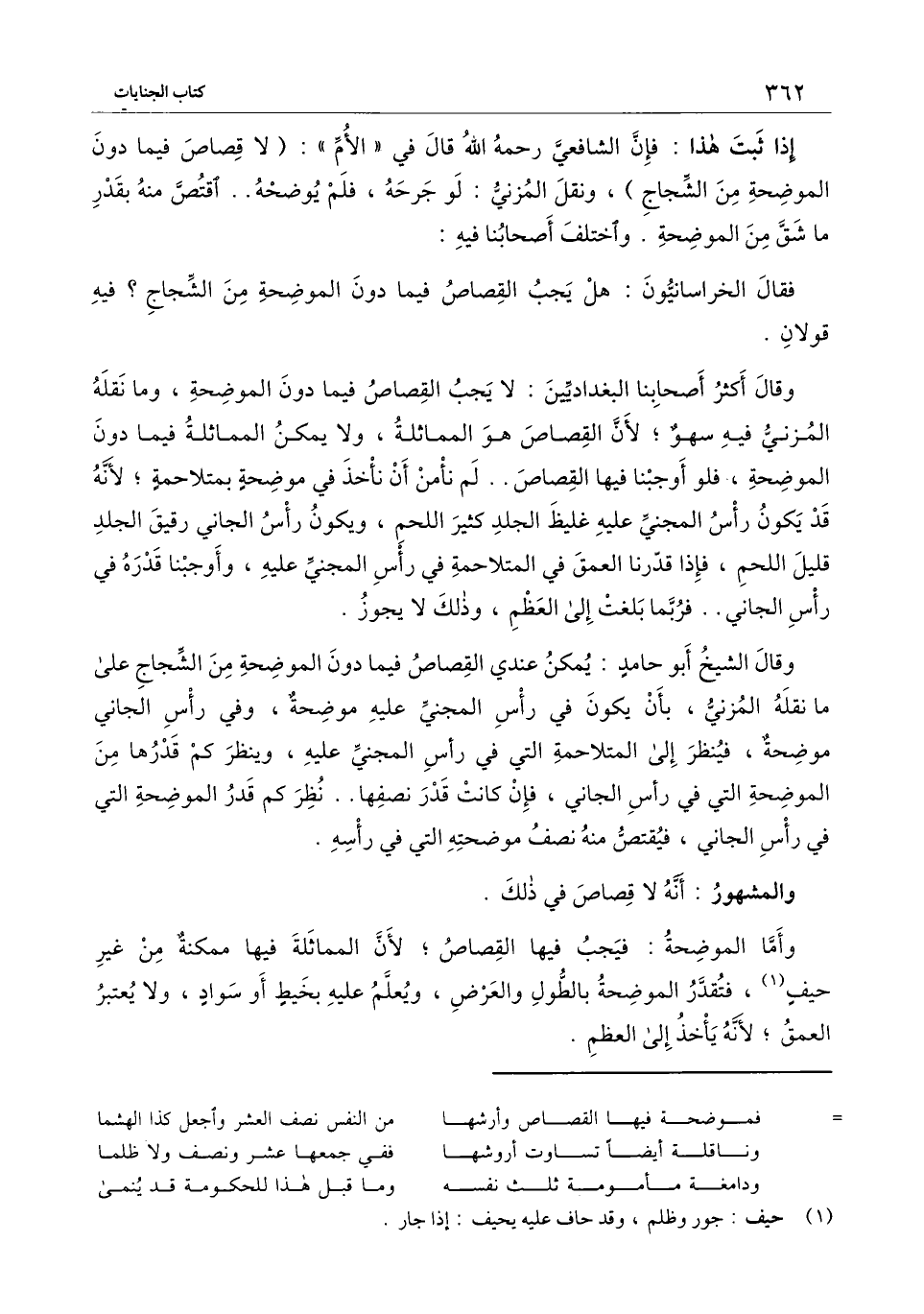 وقال أكثر أصحابنا البغداديين: لا يجب القصاص فيما دون الموضحة، وما نقله المزني فيه سهو؛ لأن القصاص هو المماثلة، ولا يمكن المماثلة فيما دون الموضحة، فلو أوجبنا فيها القصاص.. لم نأمن أن نأخذ في موضحة بمتلاحمة؛ لأنه قد يكون رأس المجني عليه غليظ الجلد كثير اللحم، ويكون رأس الجاني رقيق الجلد قليل اللحم، فإذا قدرنا العمق في المتلاحمة في رأس المجني عليه، وأوجبنا قدره في رأس الجاني.. فربما بلغت إلى العظم، وذلك لا يجوز.