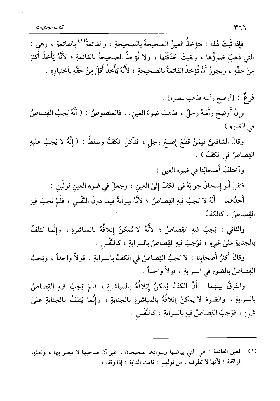 فإذا ثبت هذا: فتؤخذ العين الصحيحة بالصحيحة، والقائمة بالقائمة، وهي: التي ذهب ضوءها، وبقيت حدقتها، ولا تؤخذ الصحيحة بالقائمة؛ لأنه يأخذ أكثر من حقه، ويجوز أن تؤخذ القائمة بالصحيحة؛ لأنه يأخذ أقل من حقه باختياره.