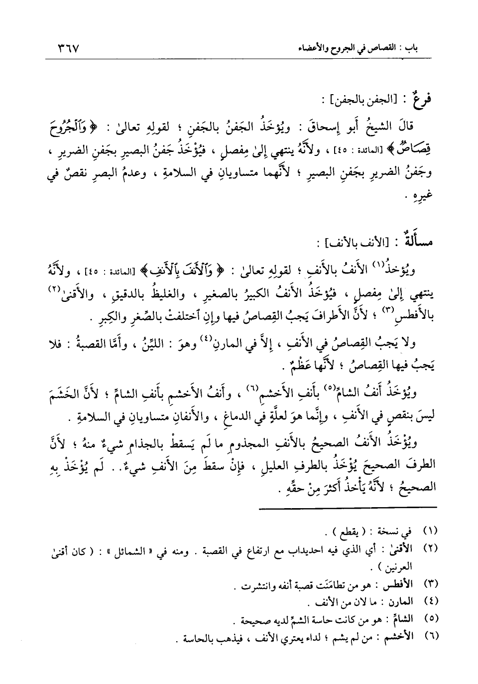 ويؤخذ الأنف بالأنف؛ لِقَوْلِهِ تَعَالَى: {وَالأَنْفَ بِالأَنْفِ} [المائدة: 45] [المائدة: 45] ، ولأنه ينتهي إلى مفصل، فيؤخذ الأنف الكبير بالصغير، والغليظ بالدقيق، والأقنى بالأفطس؛ لأن الأطراف يجب القصاص فيها وإن اختلفت بالصغر والكبر.
