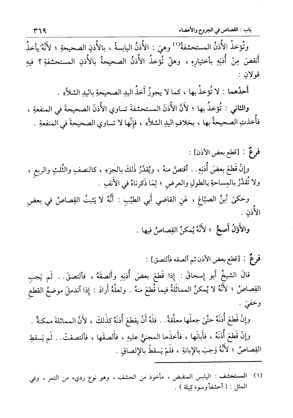 وتؤخذ الأذن المستحشفة وهي: الأذن اليابسة، بالأذن الصحيحة، لأنه يأخذ أنقص من أذنه باختياره، وهل تؤخذ الأذن الصحيحة بالأذن المستحشفة؟ فيه قولان: