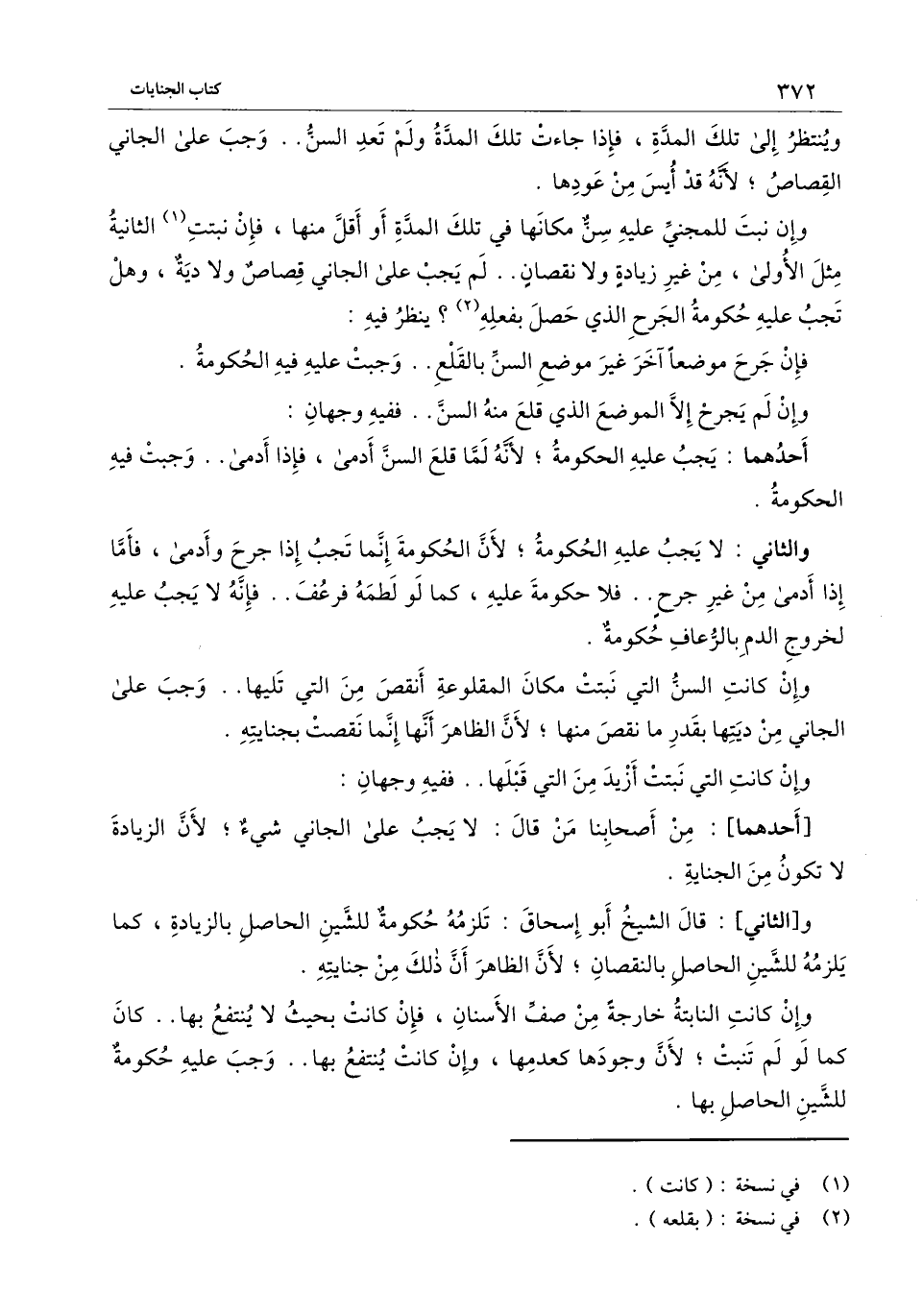 وإن نبت للمجني عليه سن مكانها في تلك المدة أو أقل منها، فإن نبتت الثانية مثل الأولى، من غير زيادة ولا نقصان.. لم يجب على الجاني قصاص ولا دية، وهل تجب عليه حكومة الجرح الذي حصل بفعله؟ ينظر فيه: