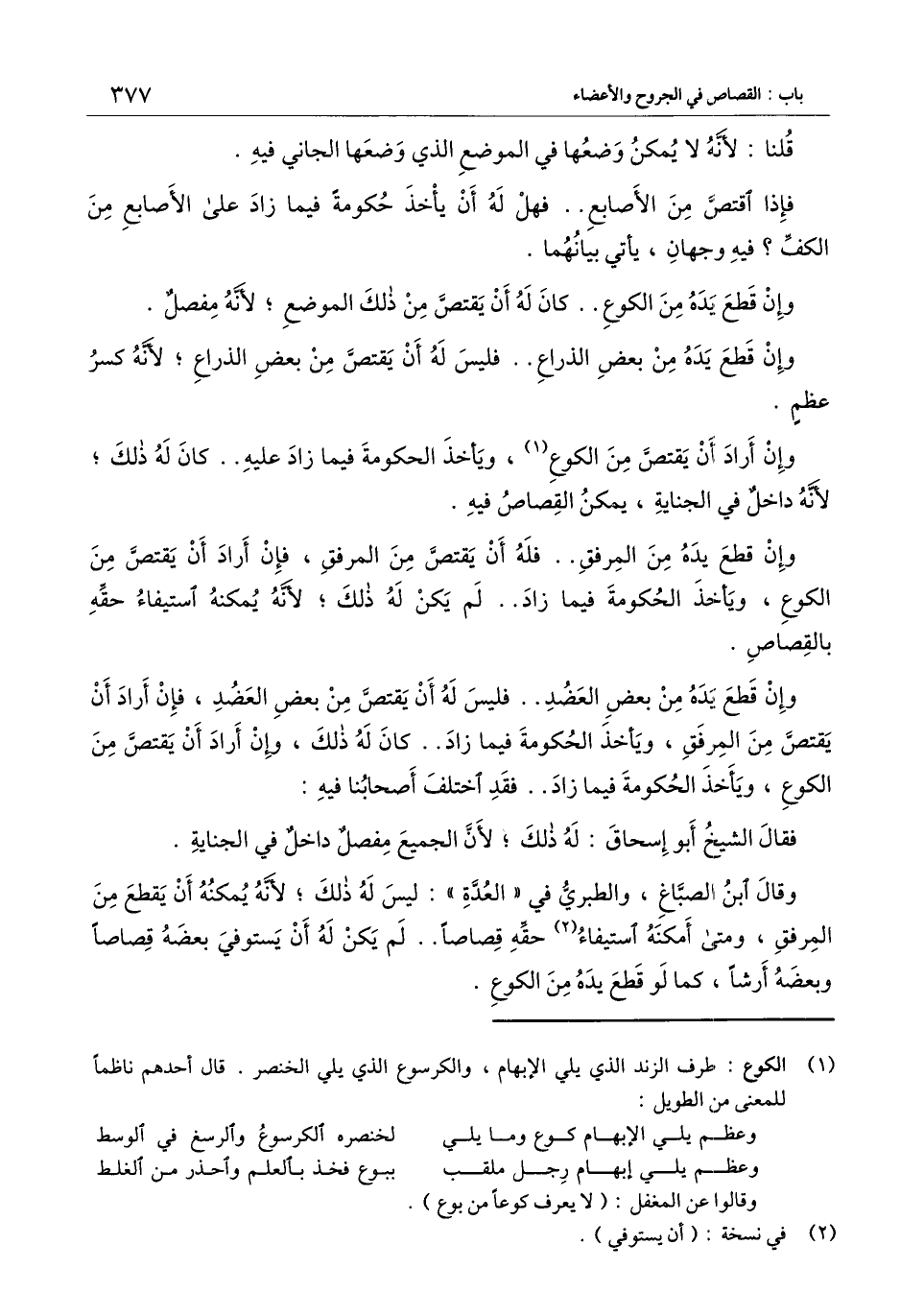 وإن قطع يده من بعض العضد.. فليس له أن يقتص من بعض العضد، فإن أراد أن يقتص من المرفق، ويأخذ الحكومة فيما زاد.. كان له ذلك، وإن أراد أن يقتص من الكوع، ويأخذ الحكومة فيما زاد.. فقد اختلف أصحابنا فيه: