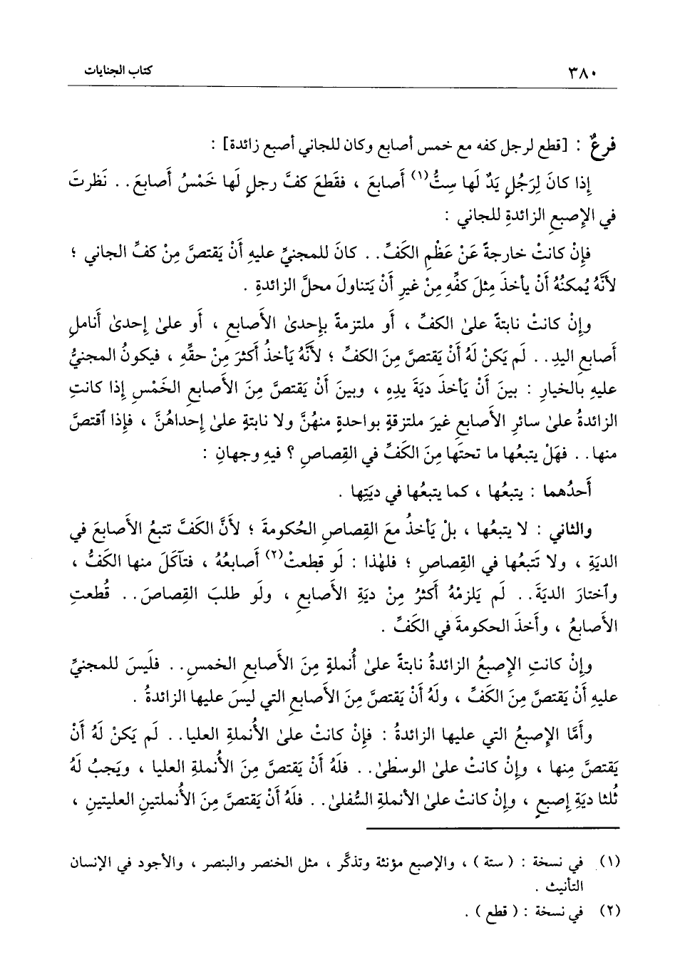 وإن كانت الإصبع الزائدة نابتة على أنملة من الأصابع الخمس.. فليس للمجني عليه أن يقتص من الكف، وله أن يقتص من الأصابع التي ليس عليها الزائدة.