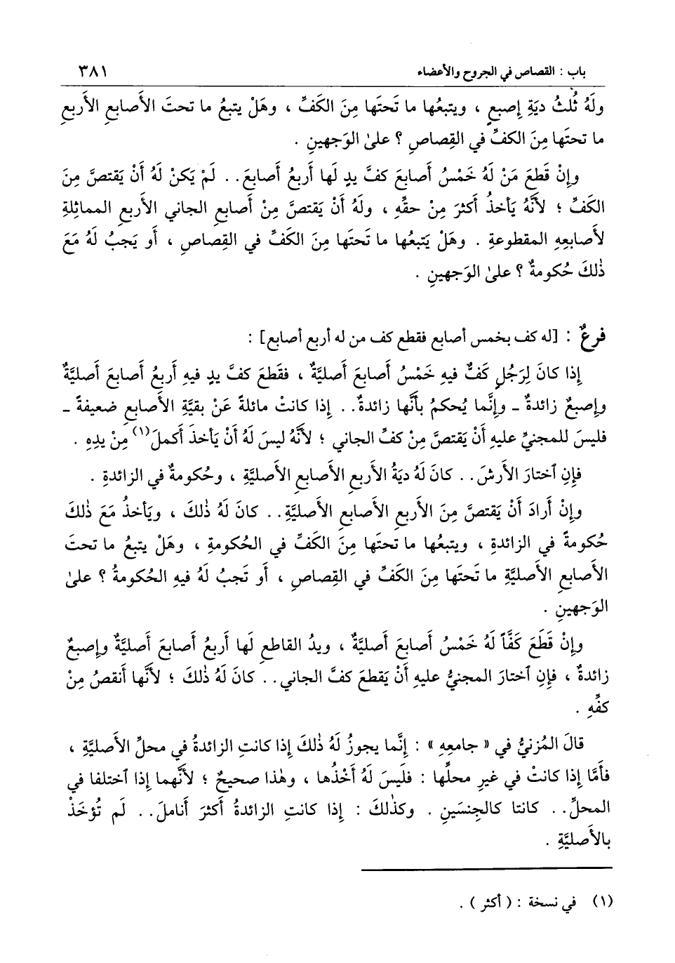 وإن أراد أن يقتص من الأربع الأصابع الأصلية.. كان له ذلك، ويأخذ مع ذلك حكومة في الزائدة، ويتبعها ما تحتها من الكف في الحكومة، وهل يتبع ما تحت الأصابع الأصلية ما تحتها من الكف في القصاص، أو تجب له فيه الحكومة؟ على الوجهين.