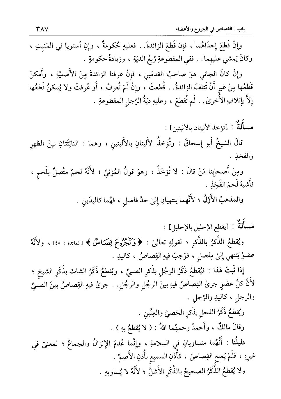 ويقطع الذكر بالذكر؛ لِقَوْلِهِ تَعَالَى: {وَالْجُرُوحَ قِصَاصٌ} [المائدة: 45] [المائدة: 45] ، ولأنه عضو ينتهي إلى مفصل، فوجب فيه القصاص، كاليد.