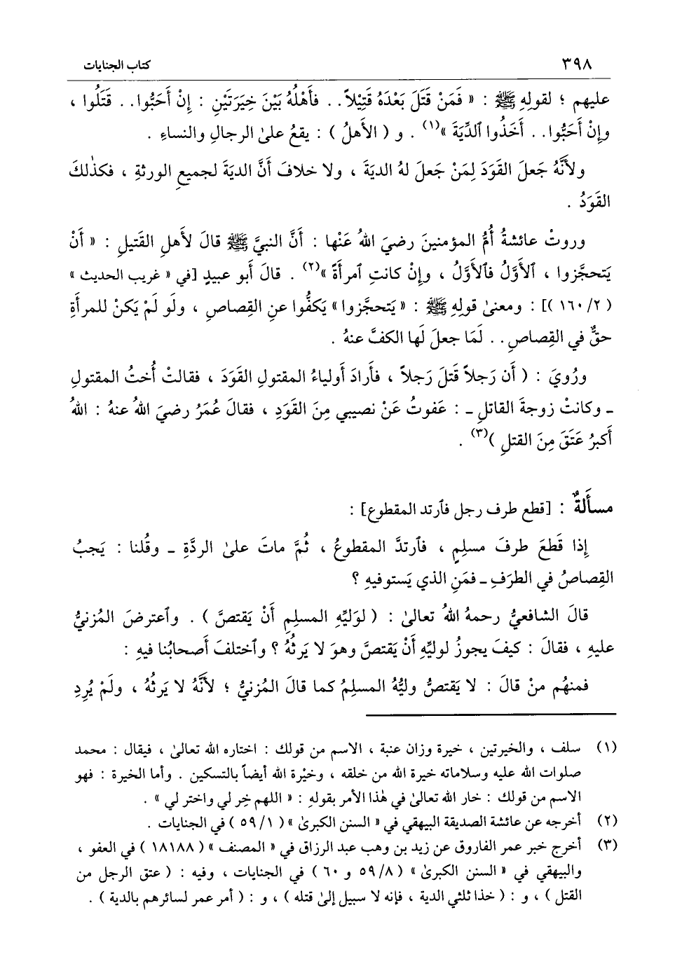 وروت عائشة أم المؤمنين - رَضِيَ اللَّهُ عَنْهَا -: «أن النبي - صَلَّى اللَّهُ عَلَيْهِ وَسَلَّمَ - قال لأهل القتيل: أن يتحجزوا، الأول فالأول، وإن كانت امرأة» قال أبو عبيد [في " غريب الحديث " (2/160) ] : ومعنى قوله - صَلَّى اللَّهُ عَلَيْهِ وَسَلَّمَ -: " يتحجزوا " يكفوا عن القصاص، ولو لم يكن للمرأة حق في القصاص.. لما جعل لها الكف عنه.