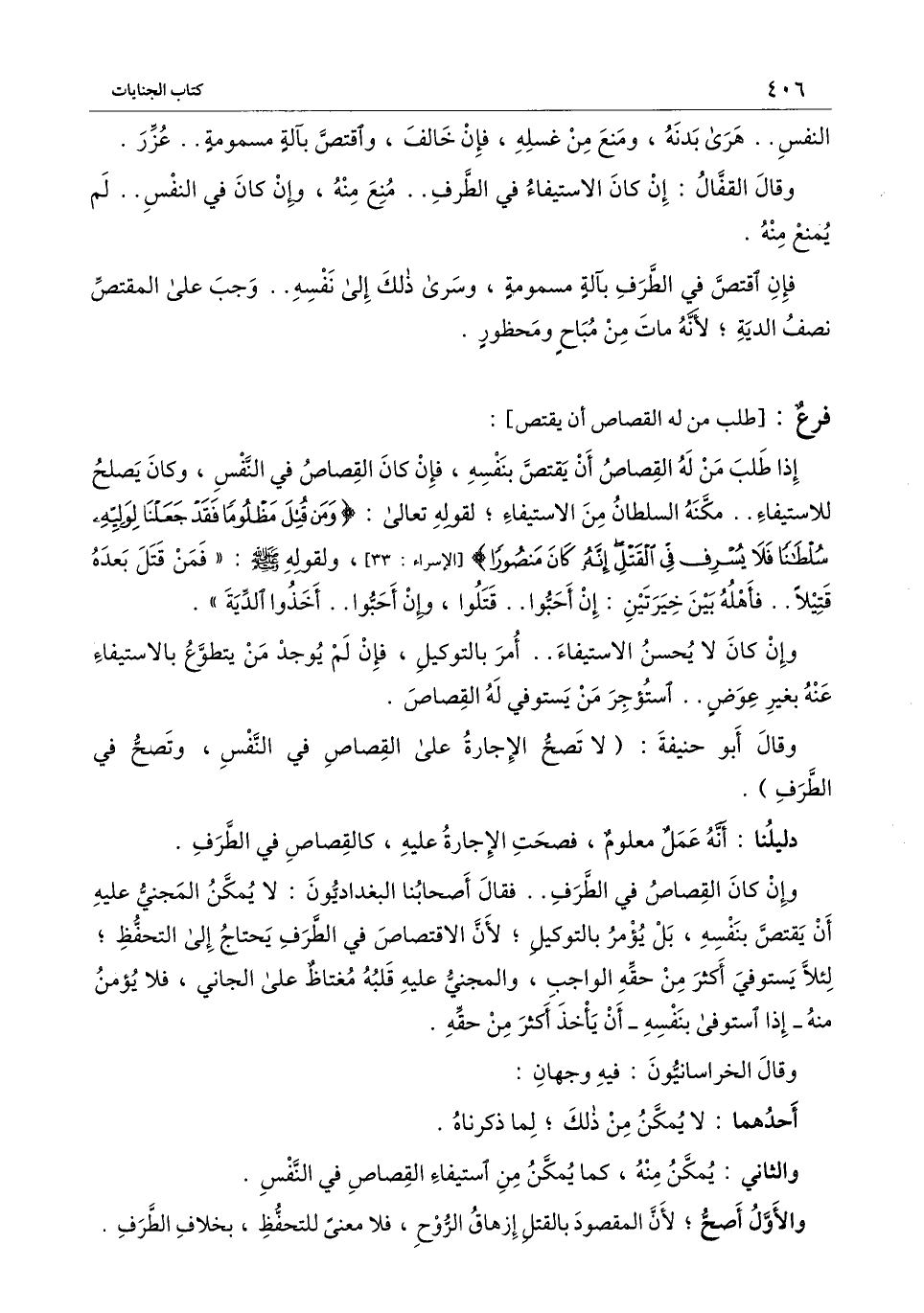 ] : إذا طلب من له القصاص أن يقتص بنفسه، فإن كان القصاص في النفس، وكان يصلح للاستيفاء.. مكنه السلطان من الاستيفاء؛ لِقَوْلِهِ تَعَالَى: {وَمَنْ قُتِلَ مَظْلُومًا فَقَدْ جَعَلْنَا لِوَلِيِّهِ سُلْطَانًا فَلا يُسْرِفْ فِي الْقَتْلِ إِنَّهُ كَانَ مَنْصُورًا} [الإسراء: 33] (الإسراء: 33) ، ولقوله - صَلَّى اللَّهُ عَلَيْهِ وَسَلَّمَ -: «فمن قتل بعده قتيلاً.. فأهله بين خيرتين: إن أحبوا.. قتلوا، وإن أحبوا.. أخذوا الدية» .