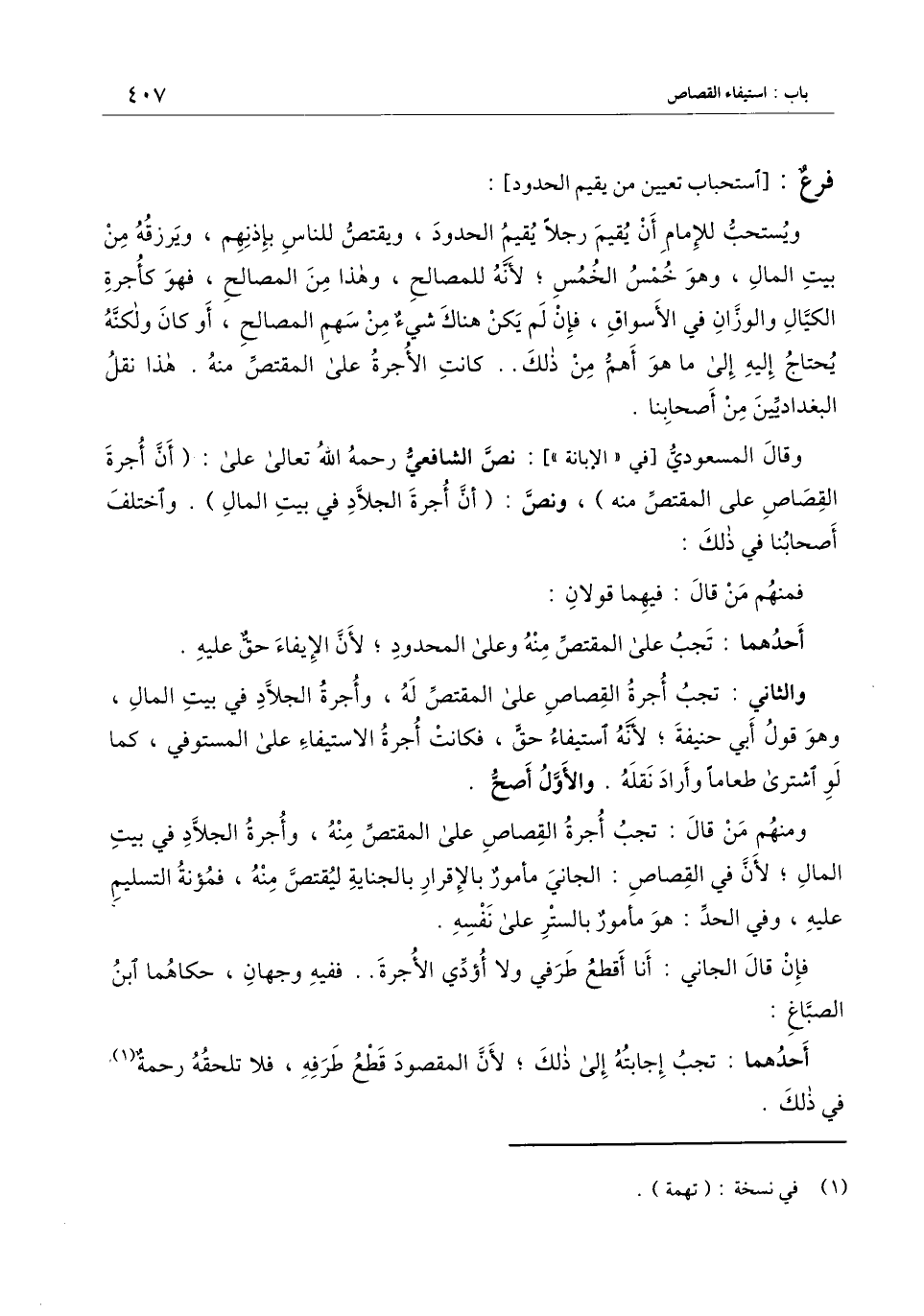 فهو كأجرة الكيال والوزان في الأسواق، فإن لم يكن هناك شيء من سهم المصالح، أو كان ولكنه يحتاج إليه إلى ما هو أهم من ذلك.. كانت الأجرة على المقتص منه. هذا نقل البغداديين من أصحابنا.
