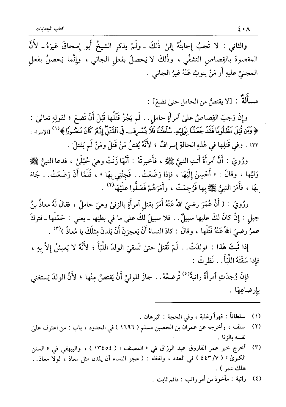 وروي: (أن عمر - رَضِيَ اللَّهُ عَنْهُ - أمر بقتل امرأة بالزنى وهي حامل، فقال له معاذ بن جبل: إن كان لك عليها سبيل.. فلا سبيل لك على ما في بطنها - يعني: حملها - فترك عمر - رَضِيَ اللَّهُ عَنْهُ - قتلها، وقال: كاد النساء أن يعجزن أن يلدن مثلك يا معاذ) .