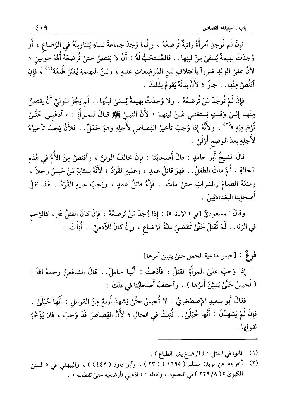 فإن لم توجد من ترضعه، ولا وجدت بهيمة يسقى لبنها.. لم يجز للولي أن يقتص منها إلى وقت يستغني عن لبنها؛ لأن النبي - صَلَّى اللَّهُ عَلَيْهِ وَسَلَّمَ - قال للمرأة: «اذهبي حتى ترضعيه» ، ولأنه إذا وجب تأخير القصاص لأجله وهو حمل.. فلأن يجب تأخيره لأجله بعد الوضع أولى.