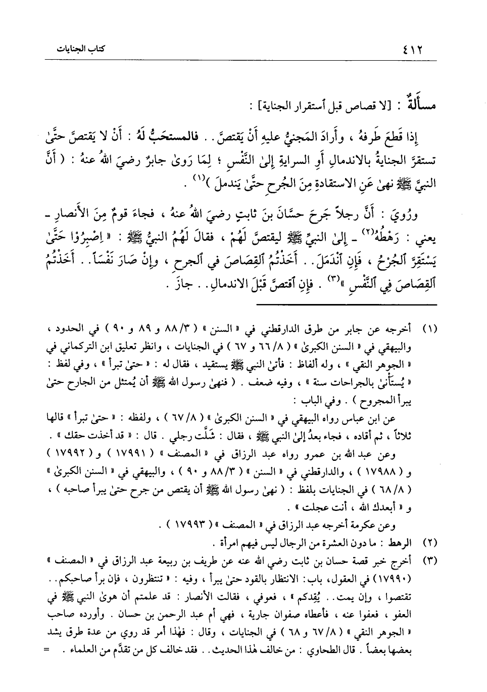 وروي: «أن رجلاً جرح حسان بن ثابت - رَضِيَ اللَّهُ عَنْهُ -، فجاء قوم من الأنصار - يعني: رهطه - إلى النبي - صَلَّى اللَّهُ عَلَيْهِ وَسَلَّمَ - ليقتص لهم، فقال لهم النبي - صَلَّى اللَّهُ عَلَيْهِ وَسَلَّمَ -: اصبروا حتى يستقر الجرح، فإن اندمل.. أخذتم القصاص في الجرح، وإن صار نفساً.. أخذتم القصاص في النفس» فإن اقتص قبل الاندمال.. جاز.