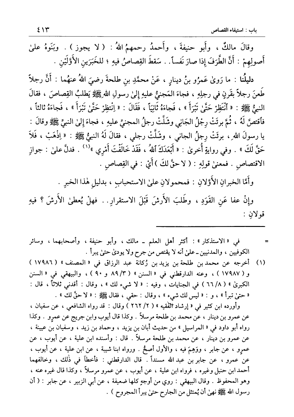 دليلنا: ما روى عمرو بن دينار، عن محمد بن طلحة - رَضِيَ اللَّهُ عَنْهُمَا -: «أن رجلا طعن رجلاً بقرن في رجله، فجاء المجني عليه إلى رسول الله - صَلَّى اللَّهُ عَلَيْهِ وَسَلَّمَ - يطلب القصاص، فقال النبي - صَلَّى اللَّهُ عَلَيْهِ وَسَلَّمَ -: " انتظر حتى تبرأ "، فجاءه ثانياً، فقال: " انتظر حتى تبرأ "، فجاءه ثالثاً، فاقتص له، ثم برئت رجل الجاني وشلت رجل المجني عليه، فجاء إلى النبي - صَلَّى اللَّهُ عَلَيْهِ وَسَلَّمَ - وقال: يا رسول الله، برئت رجل الجاني، وشلت رجلي، فقال له النبي - صَلَّى اللَّهُ عَلَيْهِ وَسَلَّمَ -: " اذهب، فلا حق لك ". وفي رواية أخرى: أبعدك الله، فقد خالفت أمري» فدل على: جواز الاقتصاص. فمعنى قوله: (لا حق لك) أي: في القصاص.