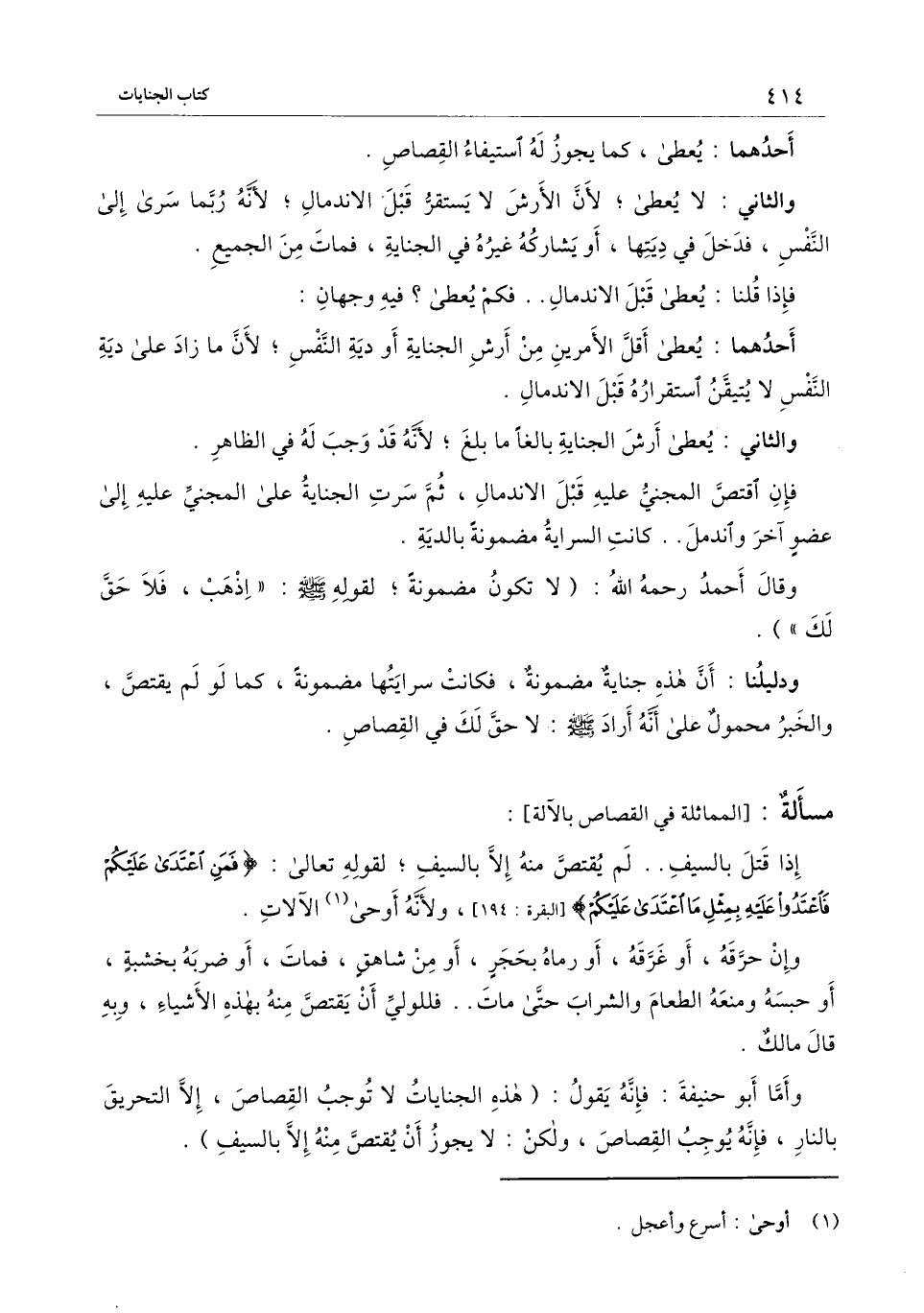 ] : إذا قتل بالسيف.. لم يقتص منه إلا بالسيف؛ لِقَوْلِهِ تَعَالَى: {فَمَنِ اعْتَدَى عَلَيْكُمْ فَاعْتَدُوا عَلَيْهِ بِمِثْلِ مَا اعْتَدَى عَلَيْكُمْ} [البقرة: 194] (البقرة: 194) ، ولأنه أوحى الآلات.