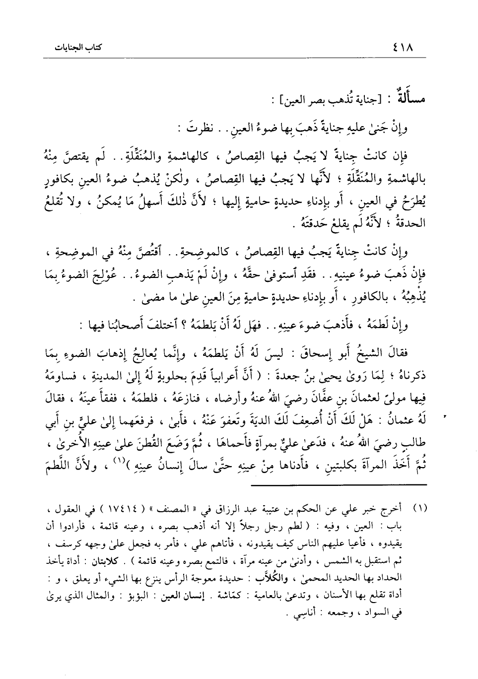 وإن جنى عليه جناية ذهب بها ضوء العين.. نظرت: