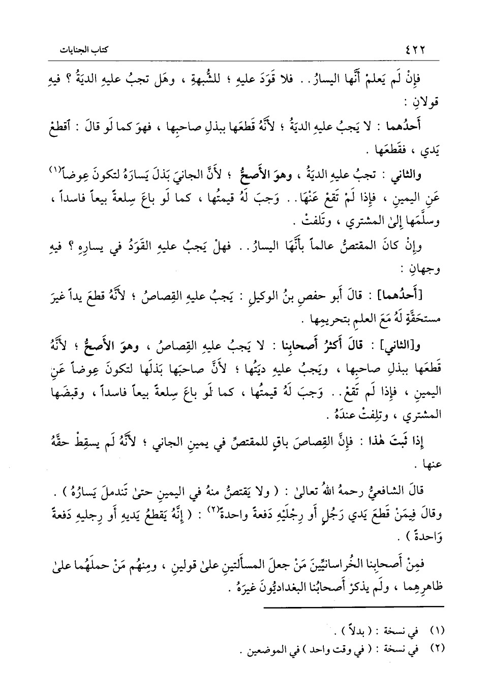 وقال الشافعي - رَحِمَهُ اللَّهُ تَعَالَى -: (ولا يقتص منه في اليمين حتى تندمل يساره) . وقال فيمن قطع يدي رجل أو رجليه دفعة واحدة: (إنه يقطع يديه أو رجليه دفعة واحدة) .
