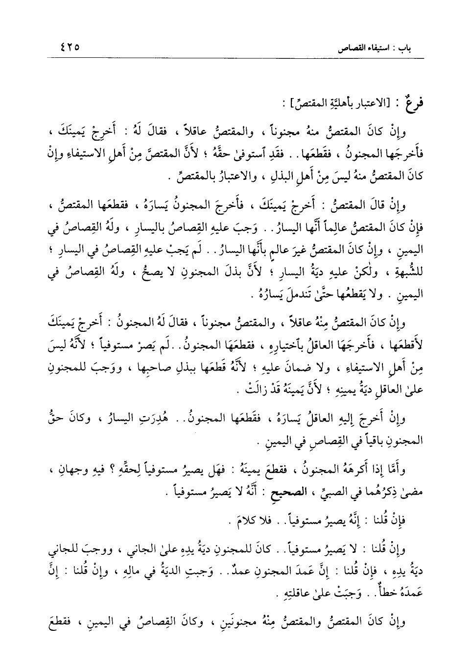 وإن كان المقتص منه مجنوناً، والمقتص عاقلاً، فقال له: أخرج يمينك، فأخرجها المجنون، فقطعها.. فقد استوفى حقه؛ لأن المقتص من أهل الاستيفاء وإن كان المقتص منه ليس من أهل البذل، والاعتبار بالمقتص.