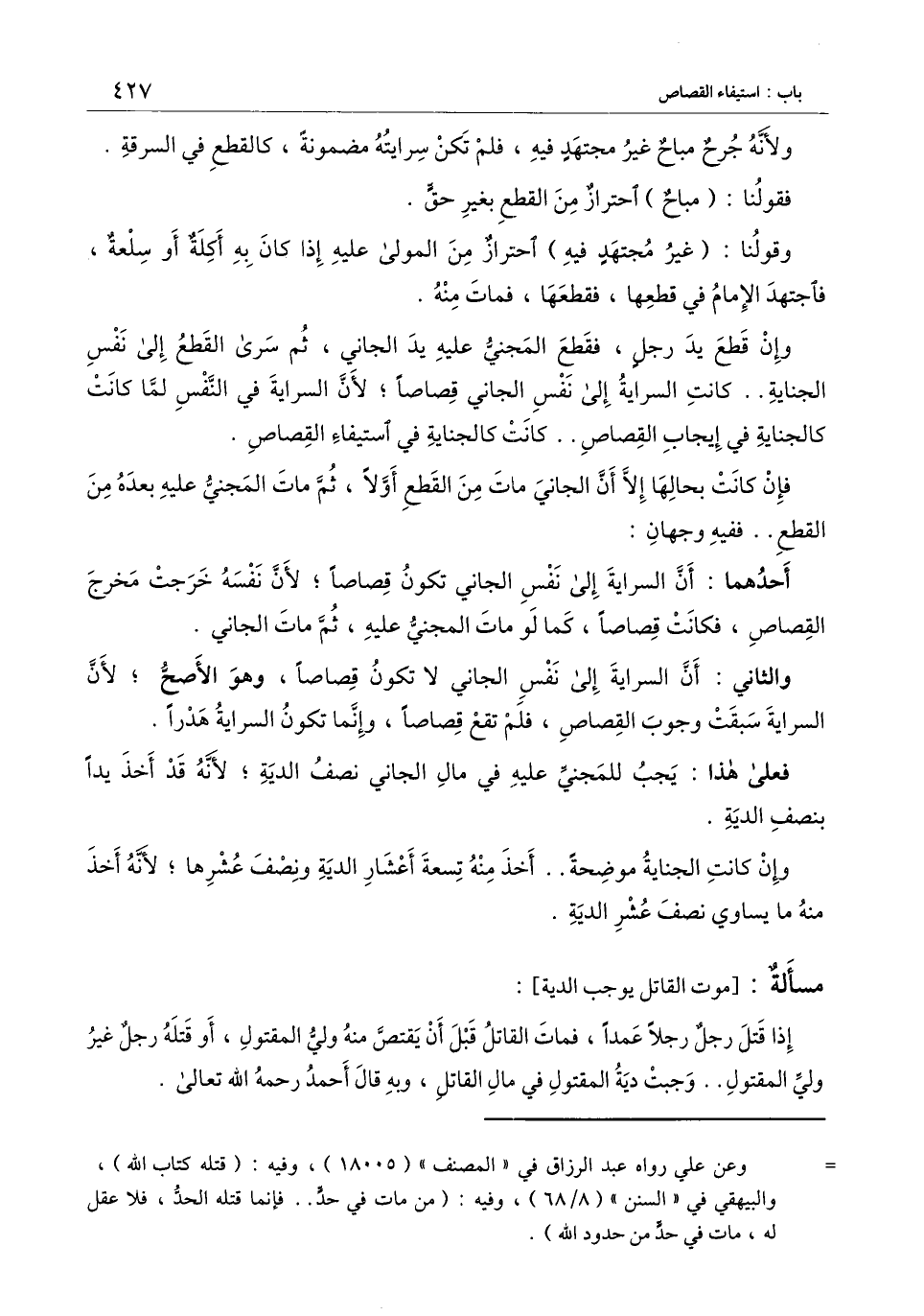 أحدهما: أن السراية إلى نفس الجاني تكون قصاصاً؛ لأن نفسه خرجت مخرج القصاص، فكانت قصاصاً، كما لو مات المجني عليه، ثم مات الجاني.