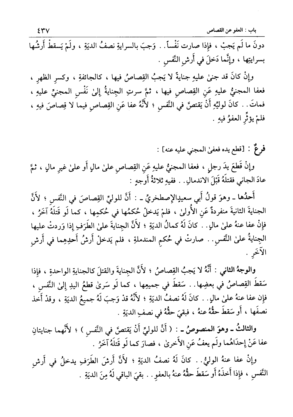 وإن قطع يد رجل، فعفا المجني عليه عن القصاص على مال أو على غير مال، ثم عاد الجاني فقتله قبل الاندمال.. ففيه ثلاثة أوجه: