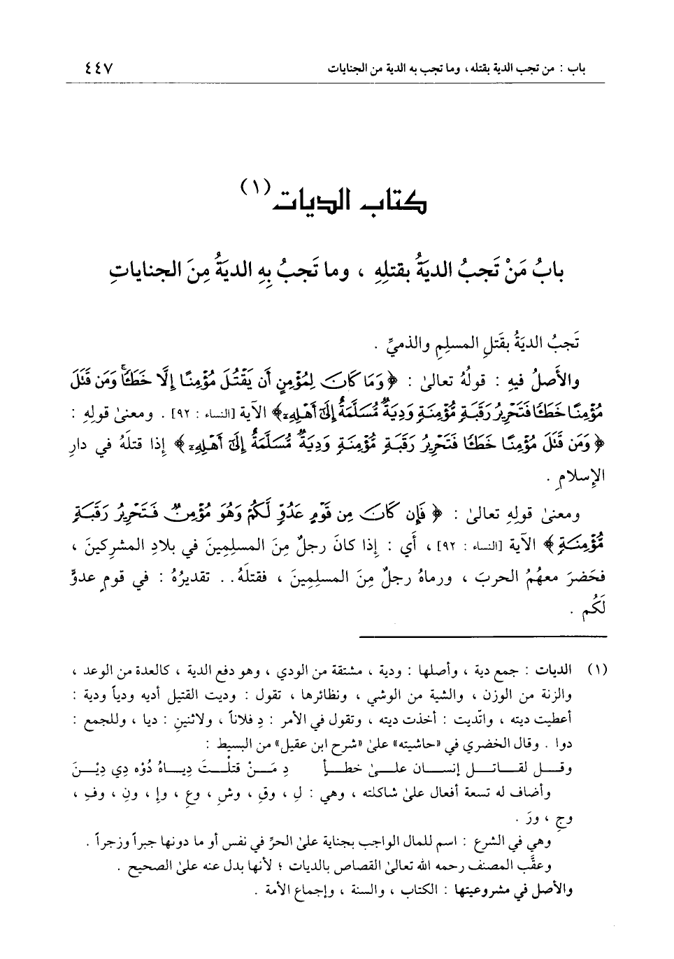 كتاب الديات باب من تجب الدية بقتله، وما تجب به الدية من الجنايات تجب الدية بقتل المسلم والذمي.