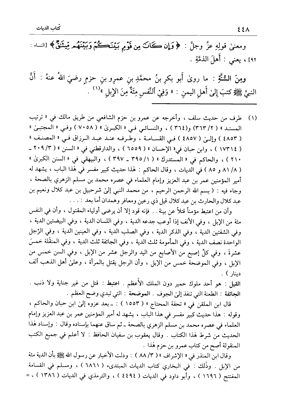 ومن السنة: ما روى أبو بكر بن محمد بن عمرو بن حزم - رَضِيَ اللَّهُ عَنْهُ -: أن النبي - صَلَّى اللَّهُ عَلَيْهِ وَسَلَّمَ - كتب إلى أهل اليمن: «وفي النفس مائة من الإبل» .