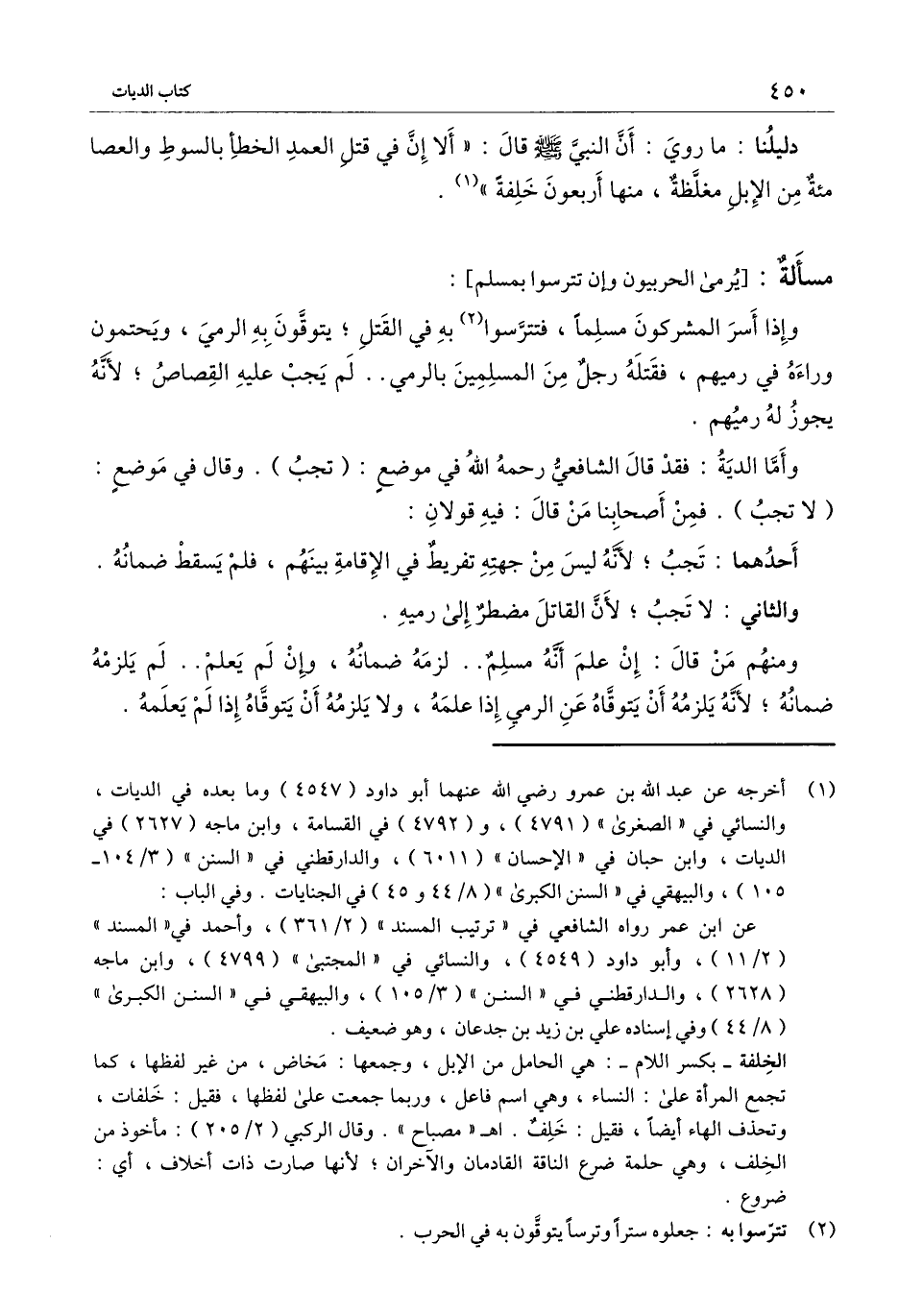 وإذا أسر المشركون مسلماً، فتتسروا به في القتل؛ يتوقون به الرمي، ويحتمون وراءه في رميهم، فقتله رجل من المسلمين بالرمي.. لم يجب عليه القصاص؛ لأنه يجوز له رميهم.