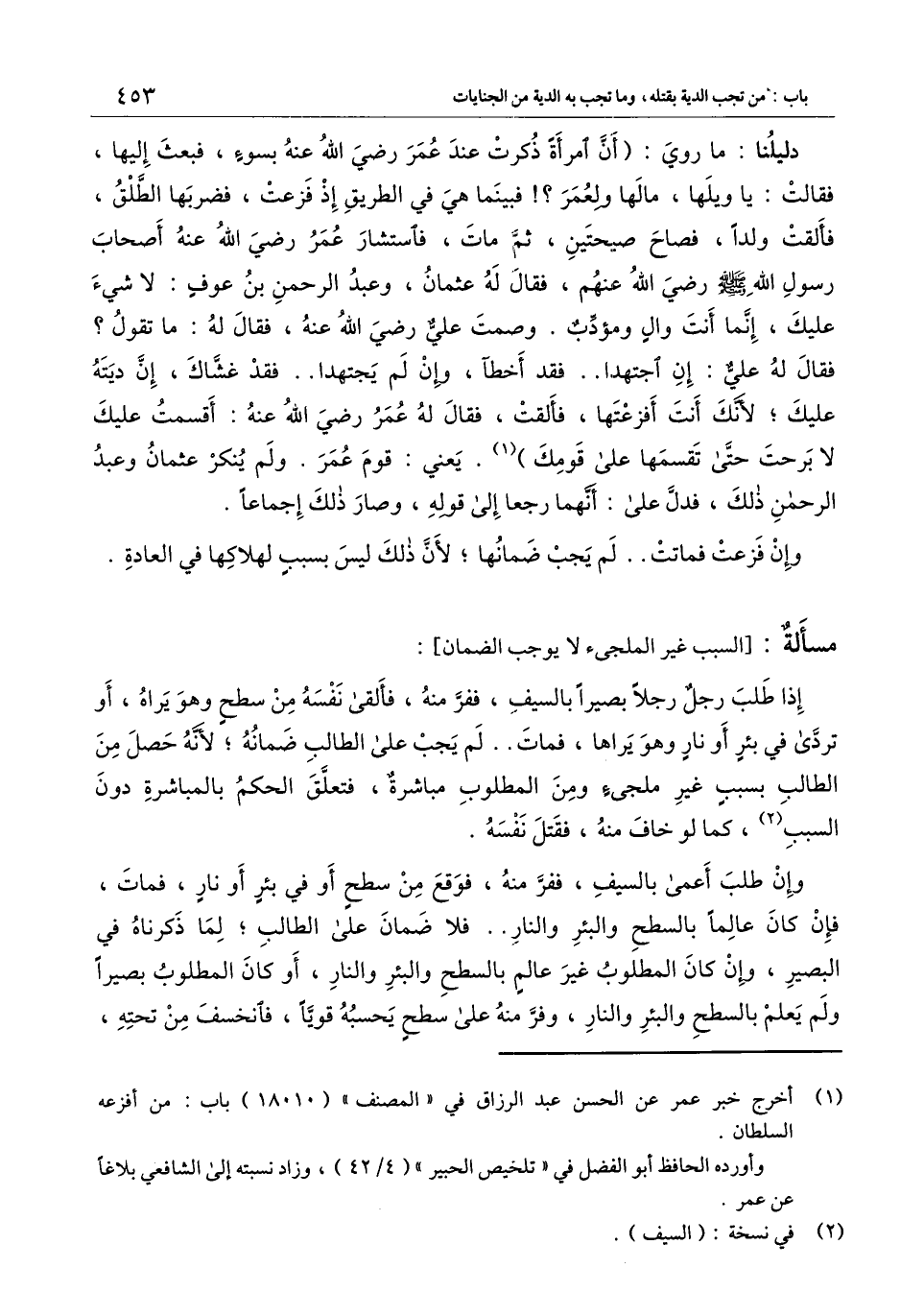 إذا طلب رجل رجلاً بصيراً بالسيف، ففر منه، فألقى نفسه من سطح وهو يراه، أو تردى في بئر أو نار وهو يراها، فمات.. لم يجب على الطالب ضمانه؛ لأنه حصل من الطالب بسبب غير ملجئ ومن المطلوب مباشرة، فتعلق الحكم بالمباشرة دون السبب، كما لو خاف منه، فقتل نفسه.
