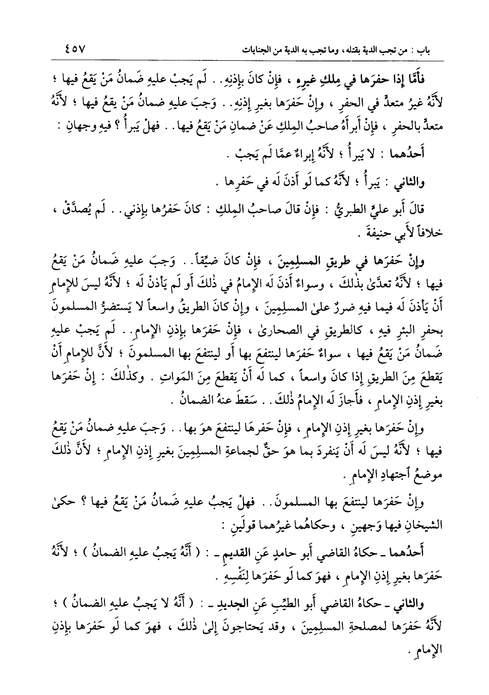 وإن حفرها في طريق المسلمين، فإن كان ضيقاً.. وجب عليه ضمان من يقع فيها؛ لأنه تعدى بذلك، وسواء أذن له الإمام في ذلك أو لم يأذن له؛ لأنه ليس للإمام أن يأذن له فيما فيه ضرر على المسلمين، وإن كان الطريق واسعاً لا يستضر المسلمون بحفر البئر فيه، كالطريق في الصحارى، فإن حفرها بإذن الإمام.. لم يجب عليه ضمان من يقع فيها، سواء حفرها لينتفع بها أو لينتفع بها المسلمون؛ لأن للإمام أن يقطع من الطريق إذا كان واسعاً، كما له أن يقطع من الموات. وكذلك: إن حفرها بغير إذن الإمام، فأجاز له الإمام ذلك.. سقط عنه الضمان.