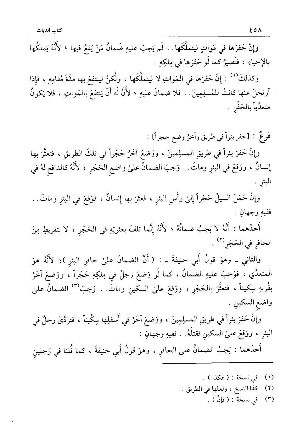 وإن حفر بئراً في طريق المسلمين، ووضع آخر في أسفلها سكيناً، فتردى رجل في البئر، ووقع على السكين فقتله.. ففيه وجهان: