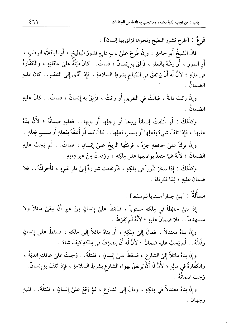 إذا بنى حائطاً في ملكه مستوياً، فسقط على إنسان من غير أن يبقى مائلاً ولا مستهدماً.. فلا ضمان عليه؛ لأنه لم يفرط.