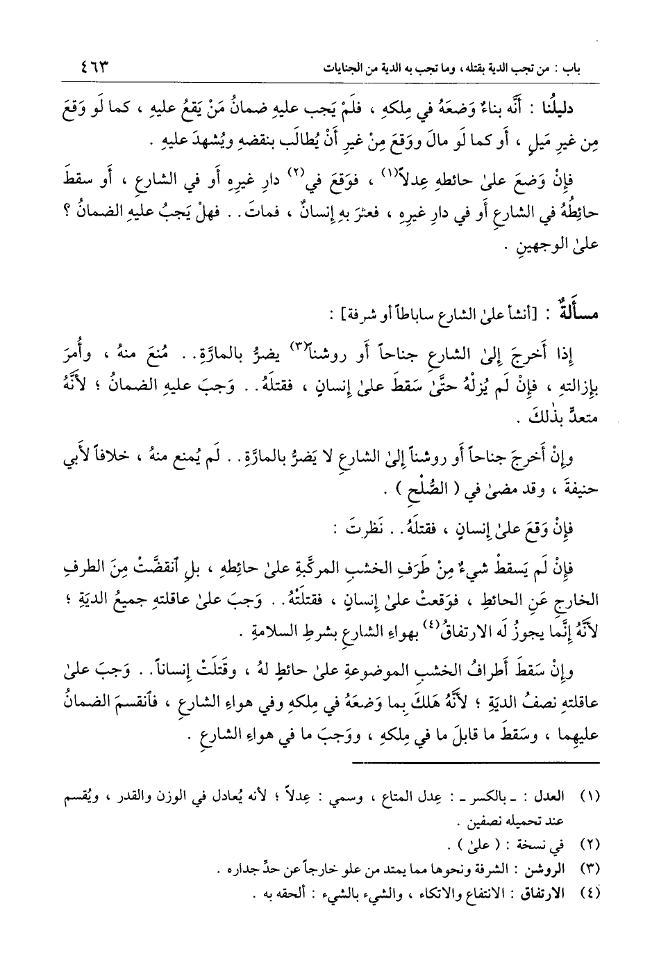 فإن لم يسقط شيء من طرف الخشب المركبة على حائطه، بل انقضت من الطرف الخارج عن الحائط، فوقعت على إنسان فقتلته.. وجب على عاقلته جميع الدية؛ لأنه إنما يجوز له الارتفاق بهواء الشارع بشرط السلامة.