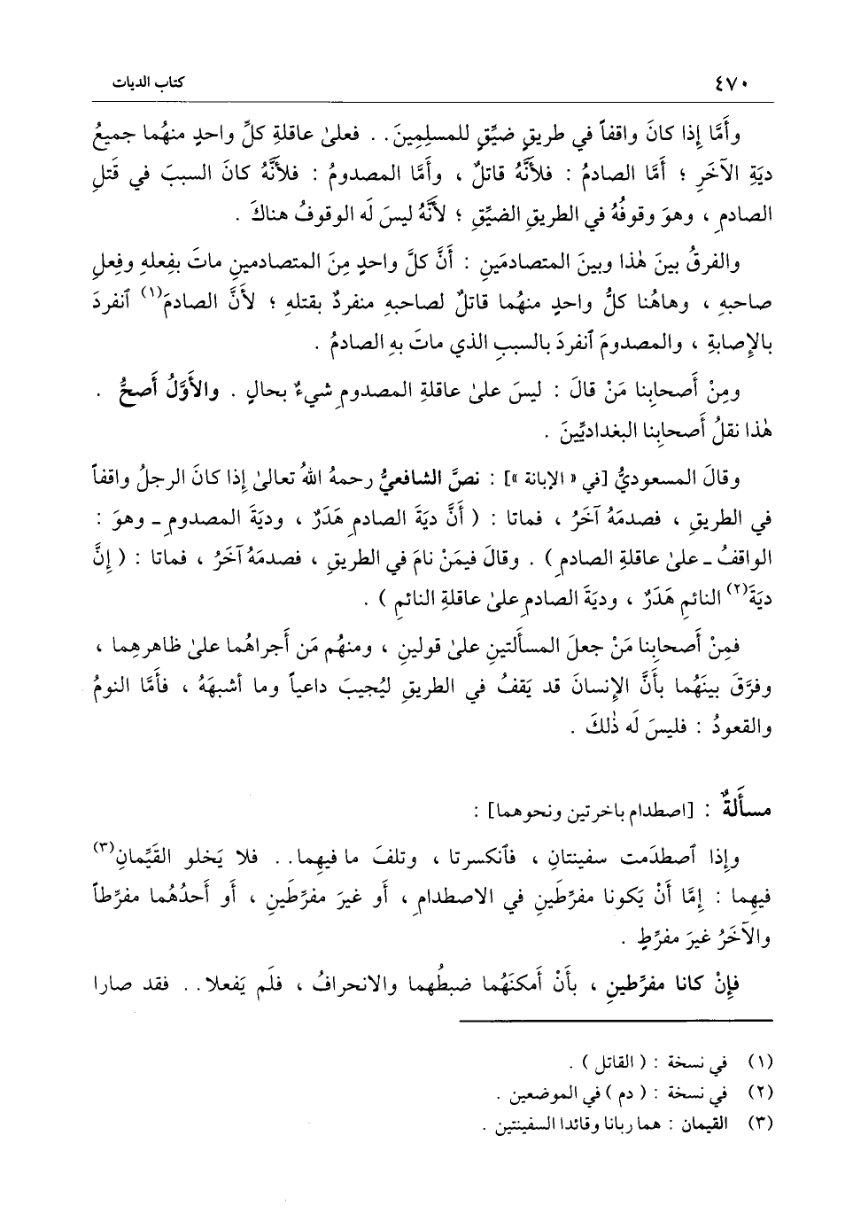 وقال المسعودي [في " الإبانة "] : نص الشافعي - رَحِمَهُ اللَّهُ تَعَالَى - إذا كان الرجل واقفاً في الطريق، فصدمه آخر، فماتا: (أن دية الصادم هدر، ودية المصدوم - وهو: الواقف - على عاقلة الصادم) . وقال فيمن نام في الطريق، فصدمه آخر، فماتا: (إن دية النائم هدر، ودية الصادم على عاقلة النائم) .