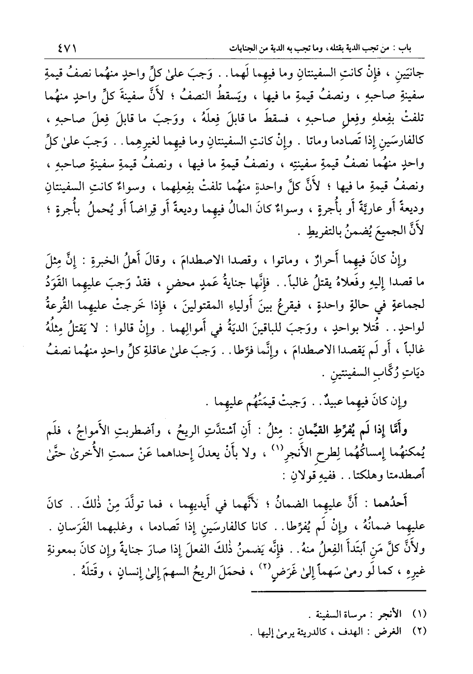 جانيين، فإن كانت السفينتان وما فيهما لهما.. وجب على كل واحد منهما نصف قيمة سفينة صاحبه، ونصف قيمة ما فيها، ويسقط النصف؛ لأن سفينة كل واحد منهما تلفت بفعله وفعل صاحبه، فسقط ما قابل فعله، ووجب ما قابل فعل صاحبه، كالفارسين إذا تصادما وماتا. وإن كانت السفينتان وما فيهما لغيرهما.. وجب على كل واحد منهما نصف قيمة سفينته، ونصف قيمة ما فيها، ونصف قيمة سفينة صاحبه، ونصف قيمة ما فيها؛ لأن كل واحدة منهما تلفت بفعلهما، وسواء كانت السفينتان وديعة أو عارية أو بأجرة، وسواء كان المال فيهما وديعة أو قراضاً أو يحمل بأجرة؛ لأن الجميع يضمن بالتفريط.
