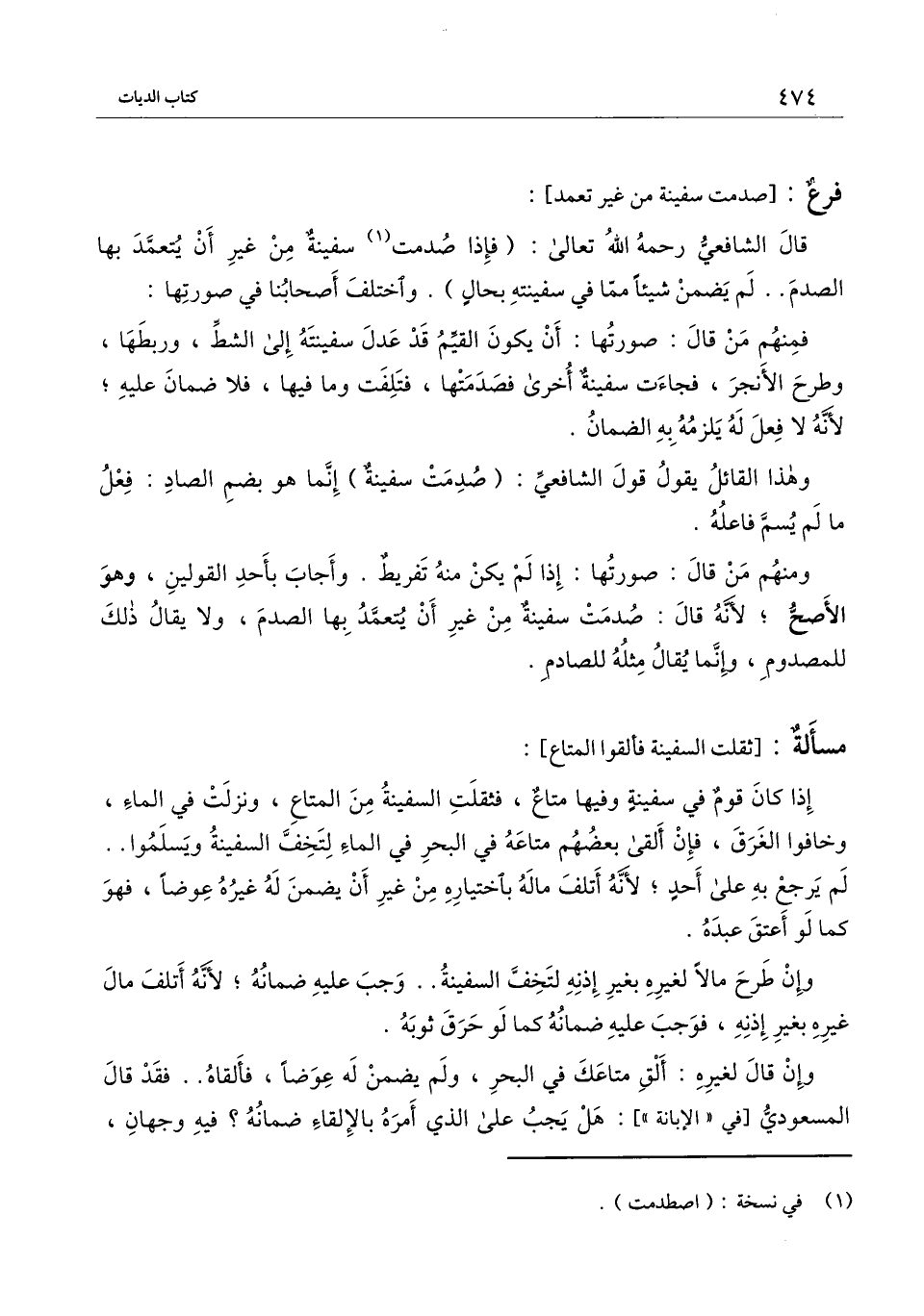 قال الشافعي - رَحِمَهُ اللَّهُ تَعَالَى -: (فإذا صدمت سفينة من غير أن يتعمد بها الصدم.. لم يضمن شيئاً مما في سفينته بحال) . واختلف أصحابنا في صورتها: