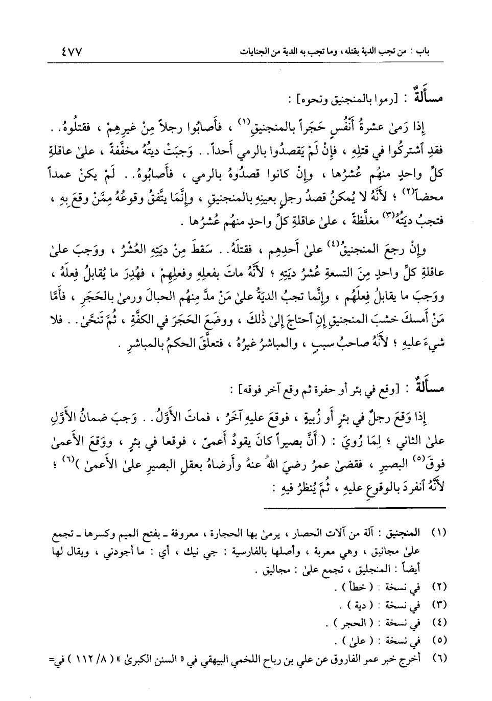 إذا رمى عشرة أنفس حجراً بالمنجنيق، فأصابوا رجلاً من غيرهم، فقتلوه.. فقد اشتركوا في قتله، فإن لم يقصدوا بالرمي أحداً.. وجبت ديته مخففة، على عاقلة كل واحد منهم عشرها، وإن كانوا قصدوه بالرمي، فأصابوه.. لم يكن عمداً محضاً؛ لأنه لا يمكن قصد رجل بعينه بالمنجنيق، وإنما يتفق وقوعه ممن وقع به، فتجب ديته مغلظة، على عاقلة كل واحد منهم عشرها.