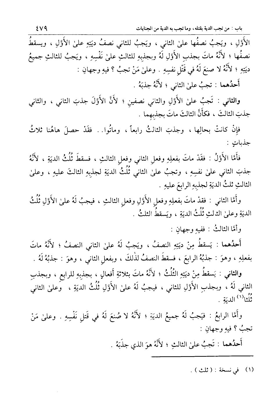فأما الأول: فقد مات بفعله وفعل الثاني وفعل الثالث، فسقط ثلث الدية، لأنه جذب الثاني على نفسه، وتجب على الثاني ثلث الدية لجذبه الثالث عليه، وعلى الثالث ثلث الدية لجذبه الرابع عليه.