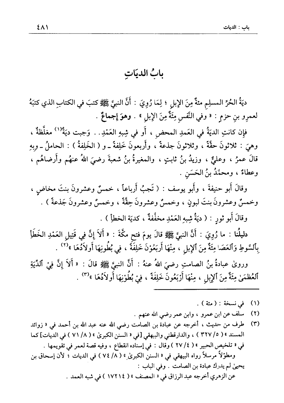 دية الحر المسلم مائة من الإبل؛ لما روي: أن النبي - صَلَّى اللَّهُ عَلَيْهِ وَسَلَّمَ - كتب في الكتاب الذي كتبه لعمرو بن حزم: «وفي النفس مائة من الإبل» . وهو إجماع.